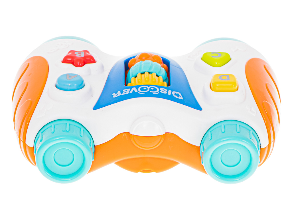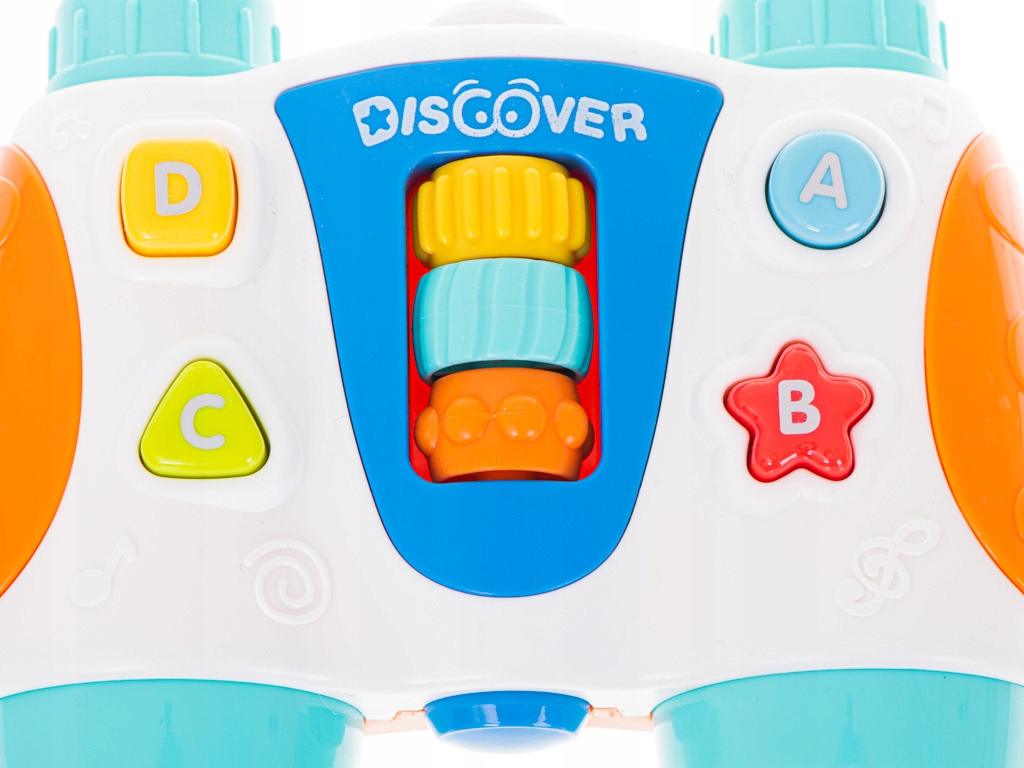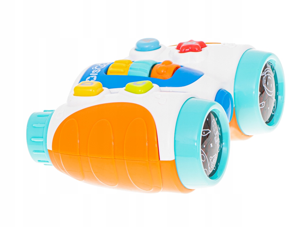 Po włożeniu dwóch baterii AA i włączeniu produktu, będzie można uruchomić dźwięki i światła! Aby to zrobić, wystarczy, że Twój maluch wciśnie duże, kolorowe przyciski znajdujące się na górze lornetki! Każdy z nich odpowiada za inny zestaw dźwięków i świateł!