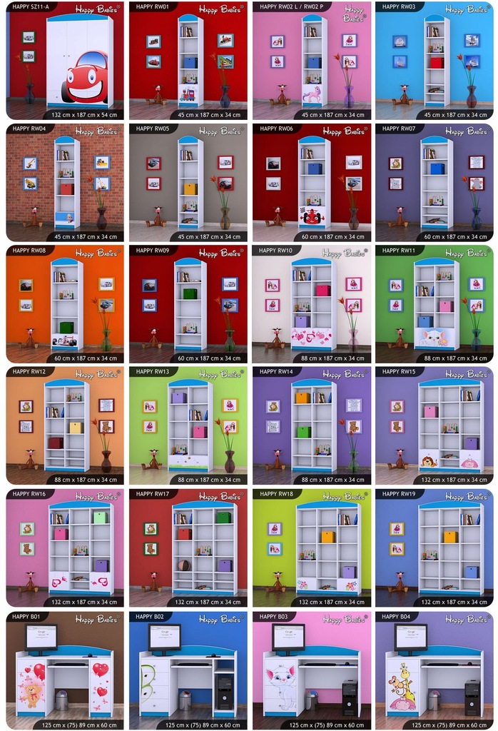 Mogą Państwo wybierać spośród prawie 90 modeli mebli (szafki nocne, kufry na zabawki, komody, regały, szafy, biurka, półki) przeznaczonych do dowolnego zaaranżowania pokoju dziecka.