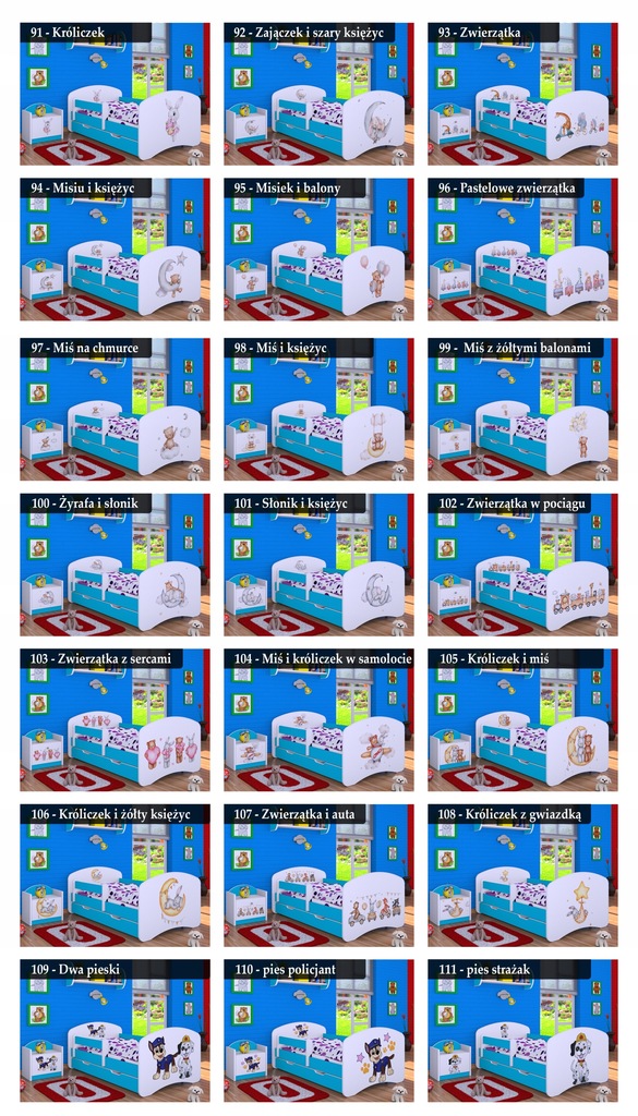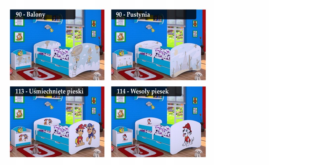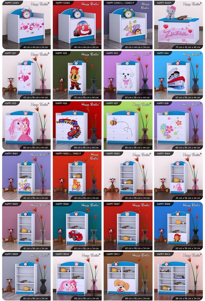 Każdy z mebli może być wykonany z motywami dostępnymi na łóżeczkach.