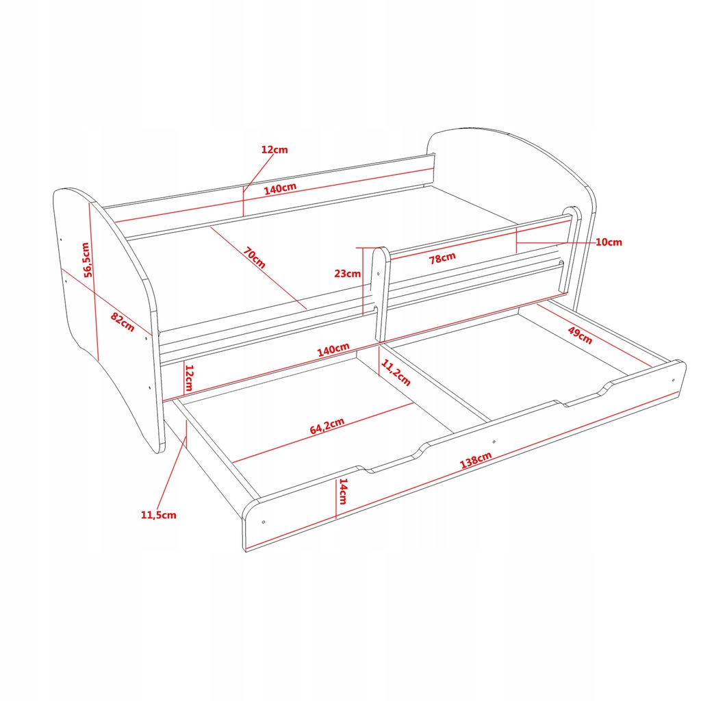 - Łóżko Happy - powierzchnia spania: 140 cm x 70 cm, wymiar całkowity: 144 cm x 82 cm x 57 cm
