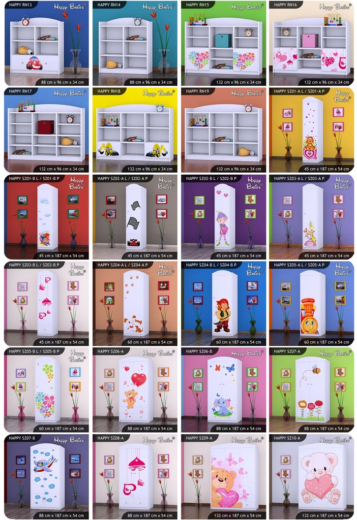 Każdy z mebli może być wykonany z motywami dostępnymi na łóżeczkach.