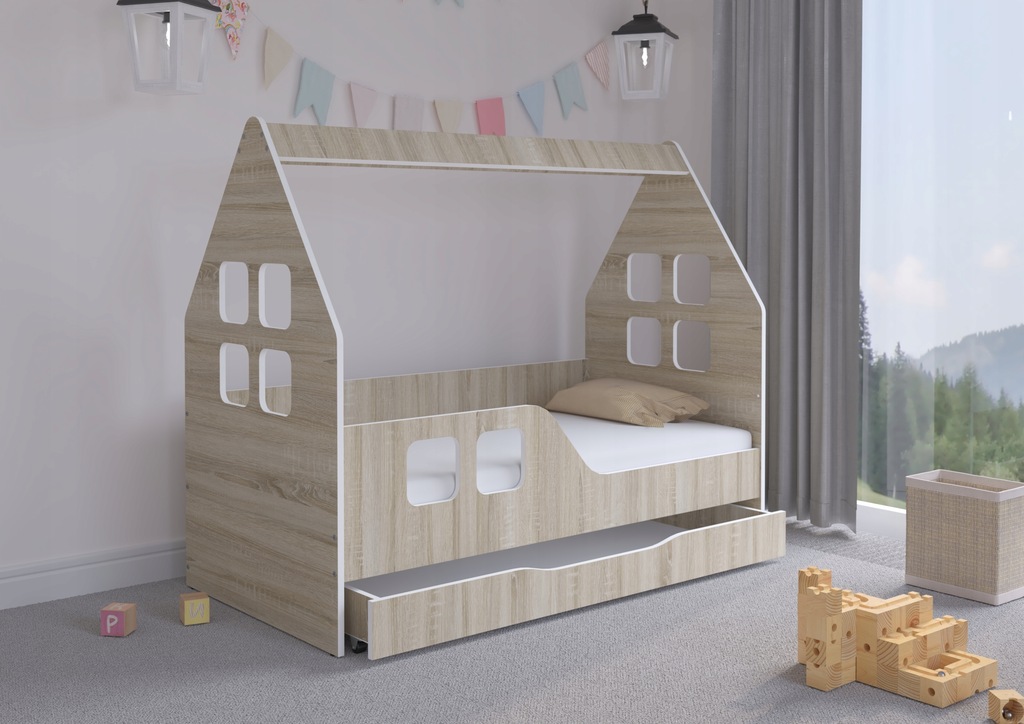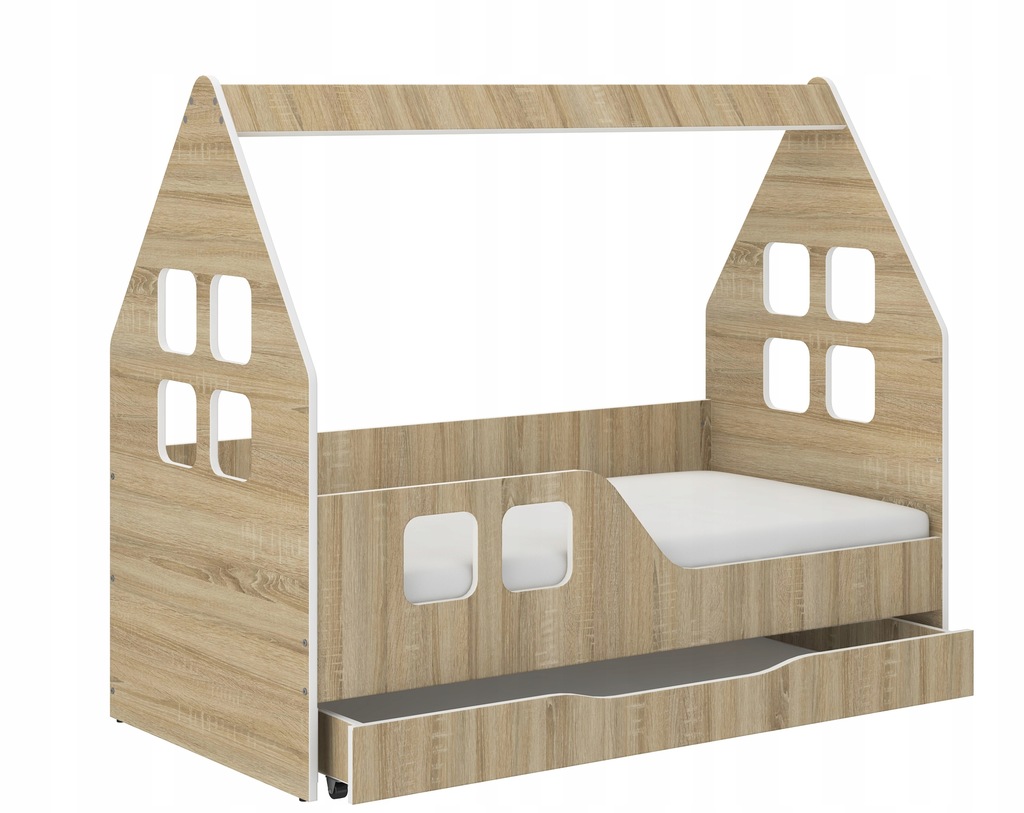 - Łóżko w kształcie domku z oknami.