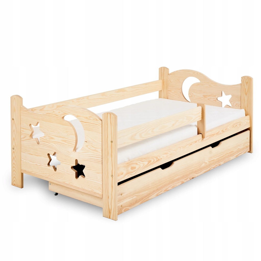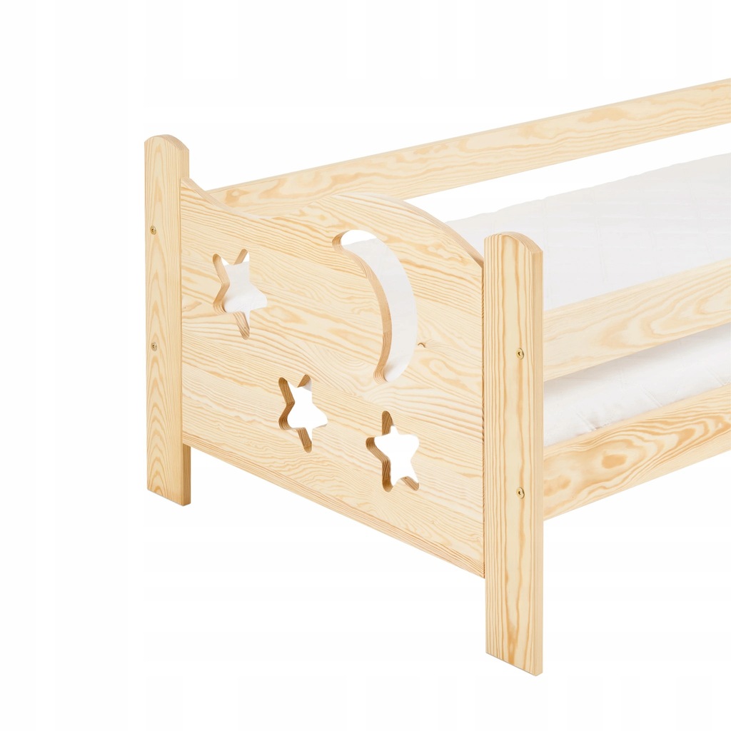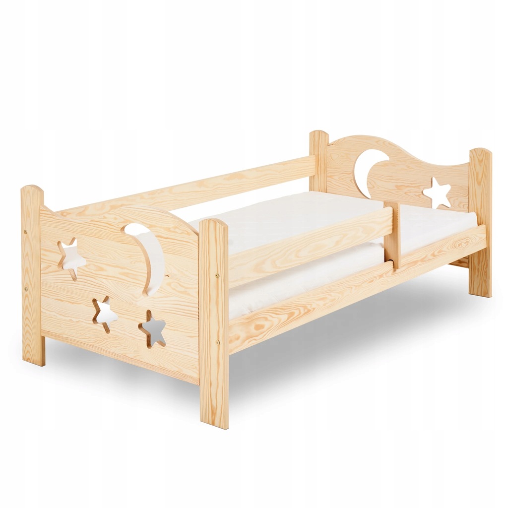 Łóżko dziecięce MOON w naturalnym odcieniu drewna sosnowego wnosi do pokoju dziecięcego ciepłą atmosferę i bajkowy klimat. Dzięki rzeźbionym motywom gwiazdek i księżyca łóżko sprawia wrażenie zabawnego i przytulnego. Jest wykonane z wysokiej jakości drewna litego i pokryte bezpiecznym dla zdrowia lakierem, który jest bezpieczny nawet dla najmłodszych dzieci. W zestawie znajduje się także boczna zapora, która chroni dziecko przed upadkiem podczas snu. Montaż jest prosty i można go przeprowadzić bez skomplikowanych narzędzi.