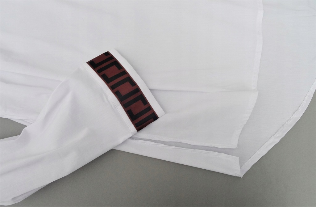 Na listwie pod którą ukryte guziki naszyta brązowa taśma z czarnymi logosami, mankiety w identycznej aranżacji.