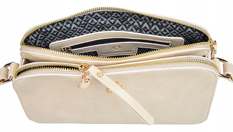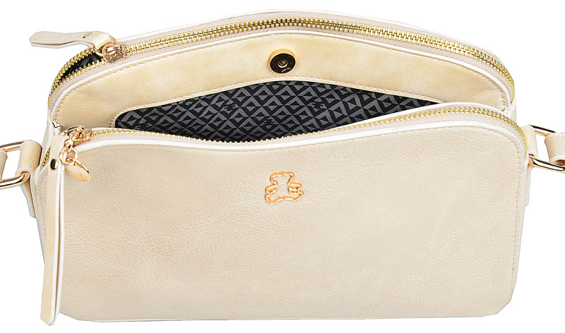Na wnętrze torebki składają się trzy oddzielne komory. Dwie z nich zamykane są na suwak, środkowa komora zapinana na magnetyczny zatrzask.