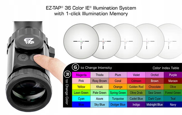 - Podświetlany punkt celowniczy: W podstawowych ustawieniach występuje w kolorach czerwonym lub zielonym. Opcjonalnie mżna dobrać wersję z palety 36 barw RGB. Dodatkowo luneta wyposażona jest w funkcję zapamiętywania ostatnio używanego koloru.