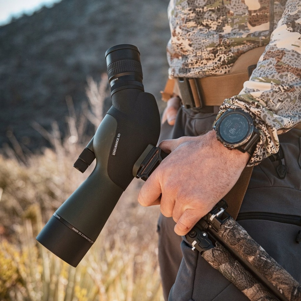 Endurance ED posiada podwójne pokrętło ostrości pozwalające na bardzo precyzyjne ogniskowanie oraz regulowaną muszlę oczną. Sprzęt jest również kompatybilny z systemem mocowania aparatów Digi-Spektiv.