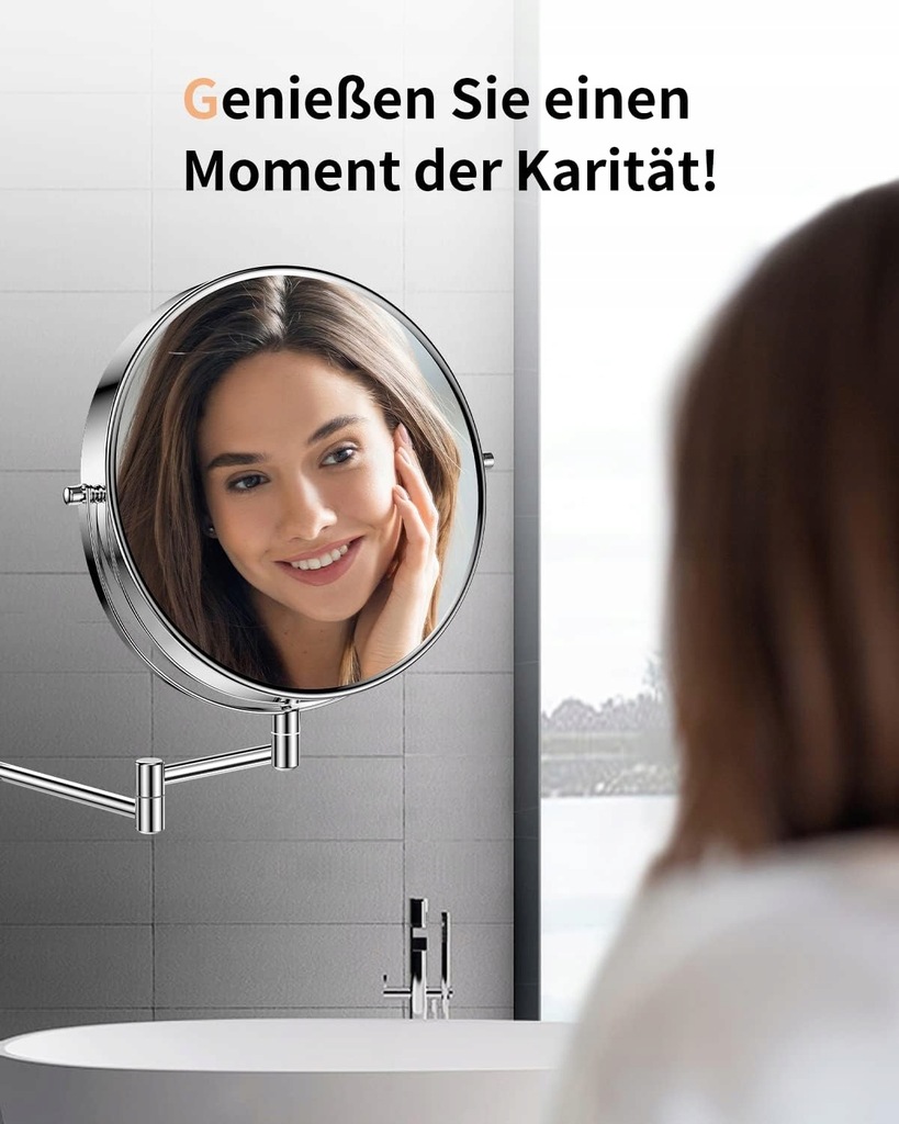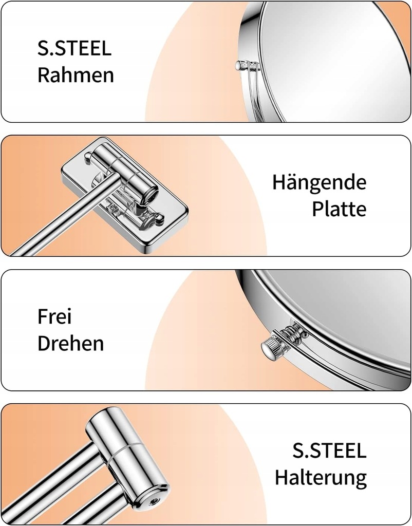 Ulepszone lustro ścienne o przekątnej 22 cm (22 cm) – nasze lustro to ulepszona wersja o średnicy 22 cm (22 x 22 cm), większe niż większość dostępnych na rynku lustro o przekątnej 22 cm. Większe dwustronne lustro o przekątnej 22,5 cm (9") ma większe pole widzenia, co jest praktyczne, dzięki czemu można się całkowicie wyraźnie widzieć.