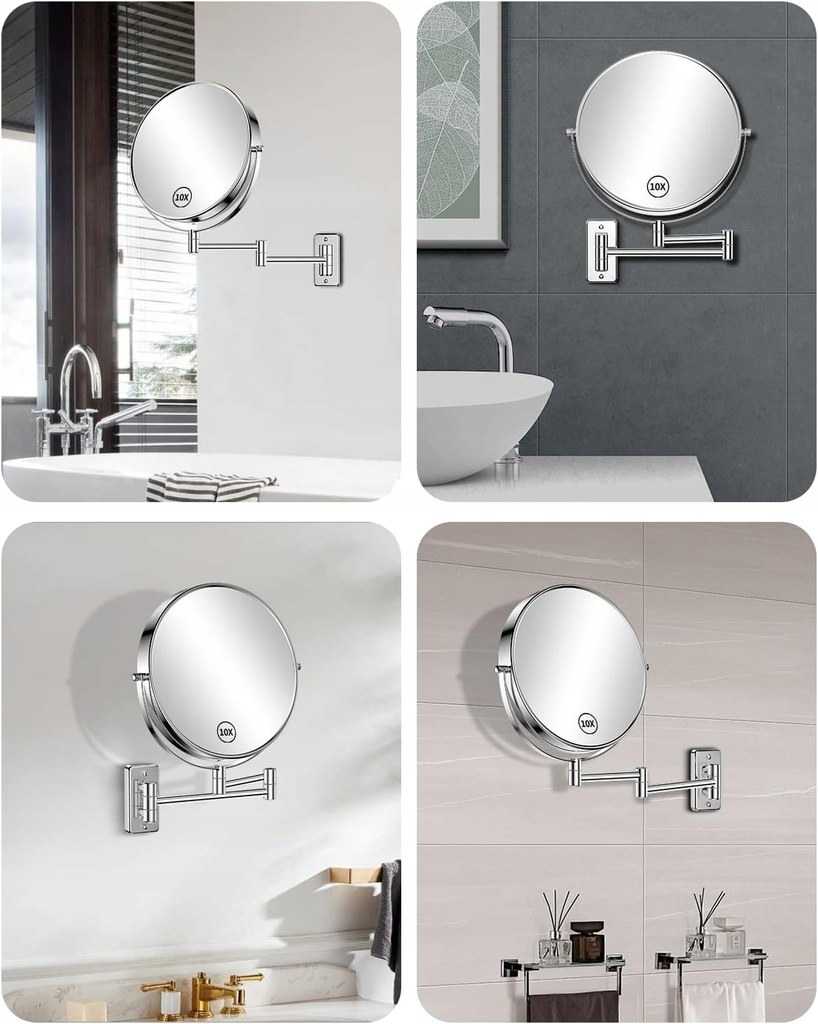 【Lustro obracane o 180° i 360°】Powierzchnia lustra ściennego może być obracana o 360°. Można go obracać o 180 stopni wewnątrz ramy i 360 stopni na obu wysuwanych ramionach. Lustro można dopasować do każdego kąta i dowolnej pozycji, której potrzebujesz. W przypadku nieużywania można go złożyć, oszczędzając miejsce.