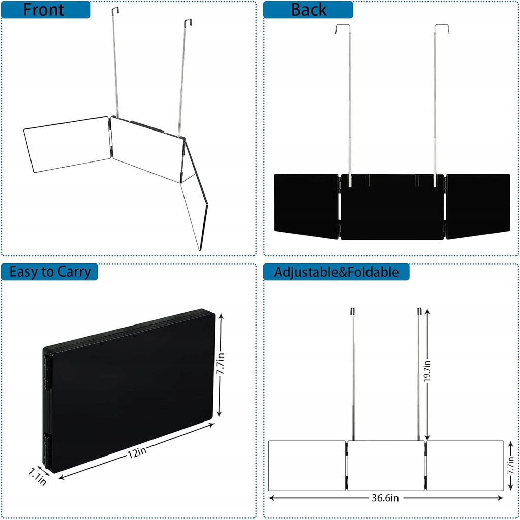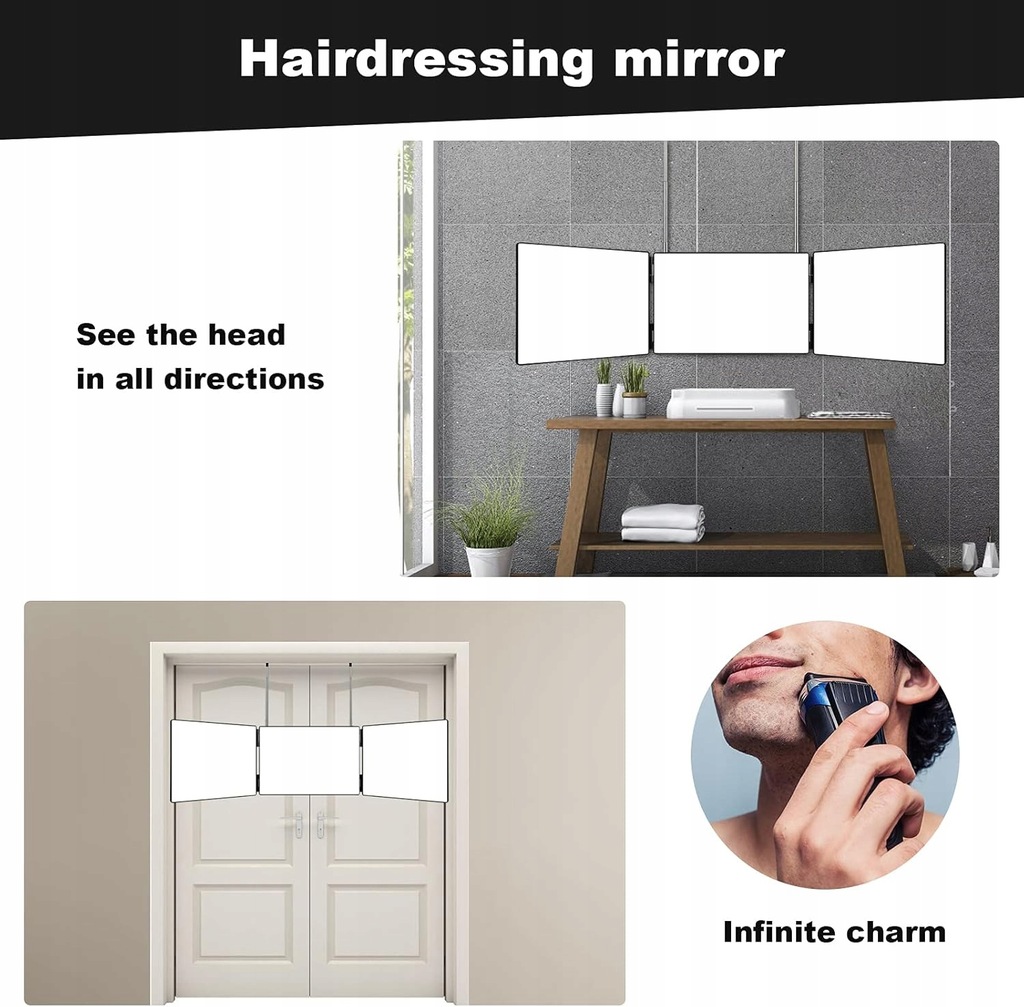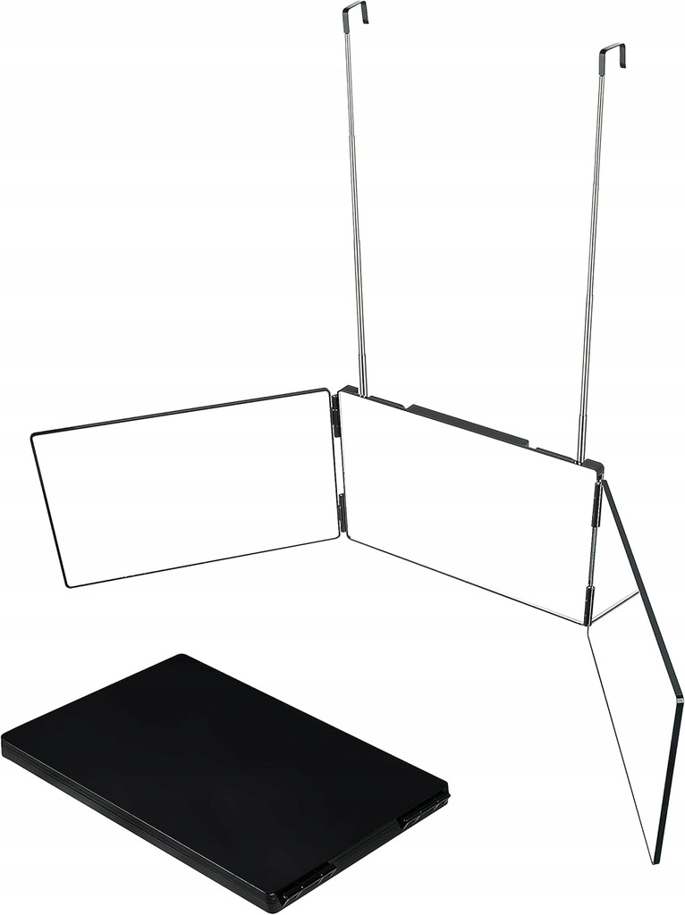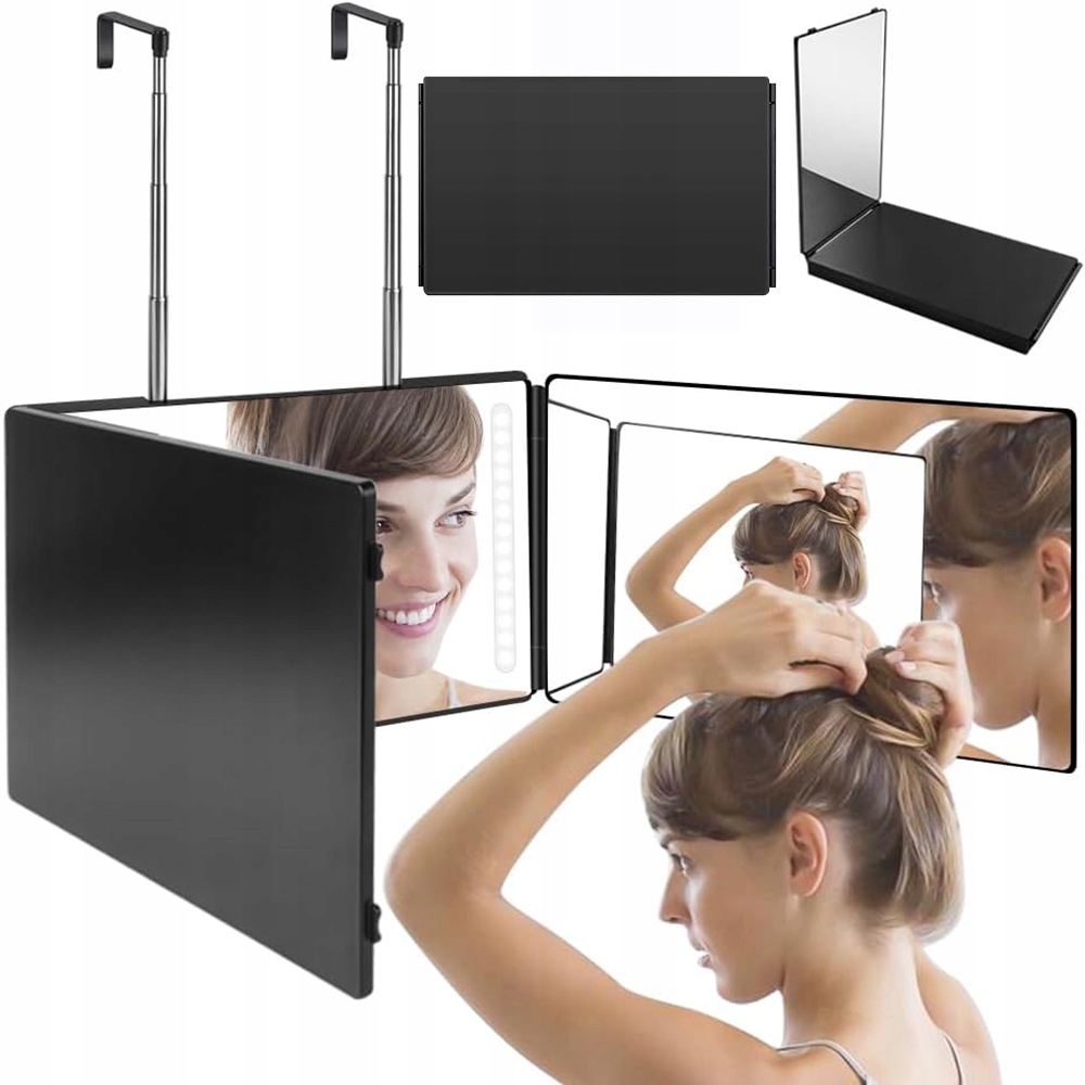 - Łatwy w użyciu: możesz łatwo i bezpiecznie powiesić na dowolnej belce (na przykład na drzwiach, szafie, oknach itp.). Możesz również wybrać użycie tego potrójnego lustra do strzyżenia na każdym stole lub blacie.