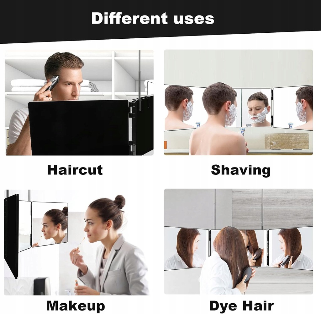 - Kąt widzenia 360: potrójne lustro ułatwia dostrzenie wszystkich zakątków głowy i twarzy. Jeśli chcesz zrobić makijaż, golenie, farbować, kręcić lub obcinać włosy, trójkierunkowe lusterko do makijażu będzie prawdziwym pomocnikiem.
