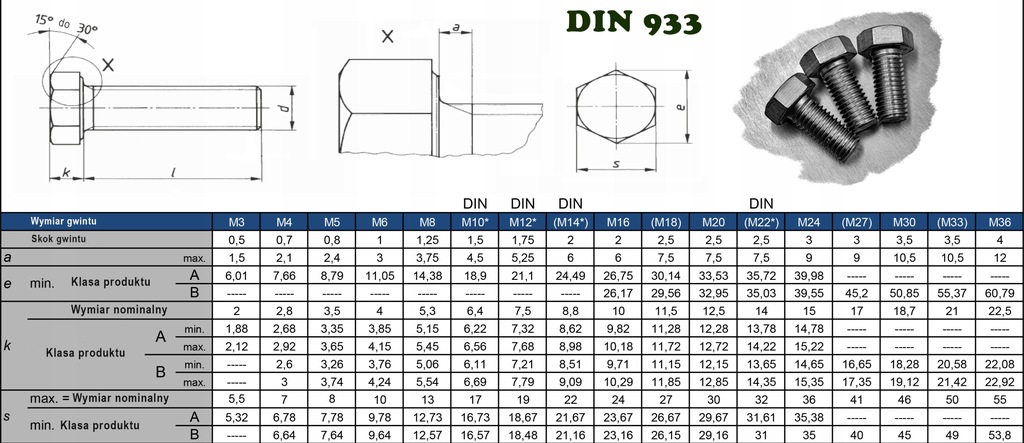 ŚRUBA Z ŁBEM SZEŚCIOKĄTNYM Z GWINTEM PEŁNYM DIN 933