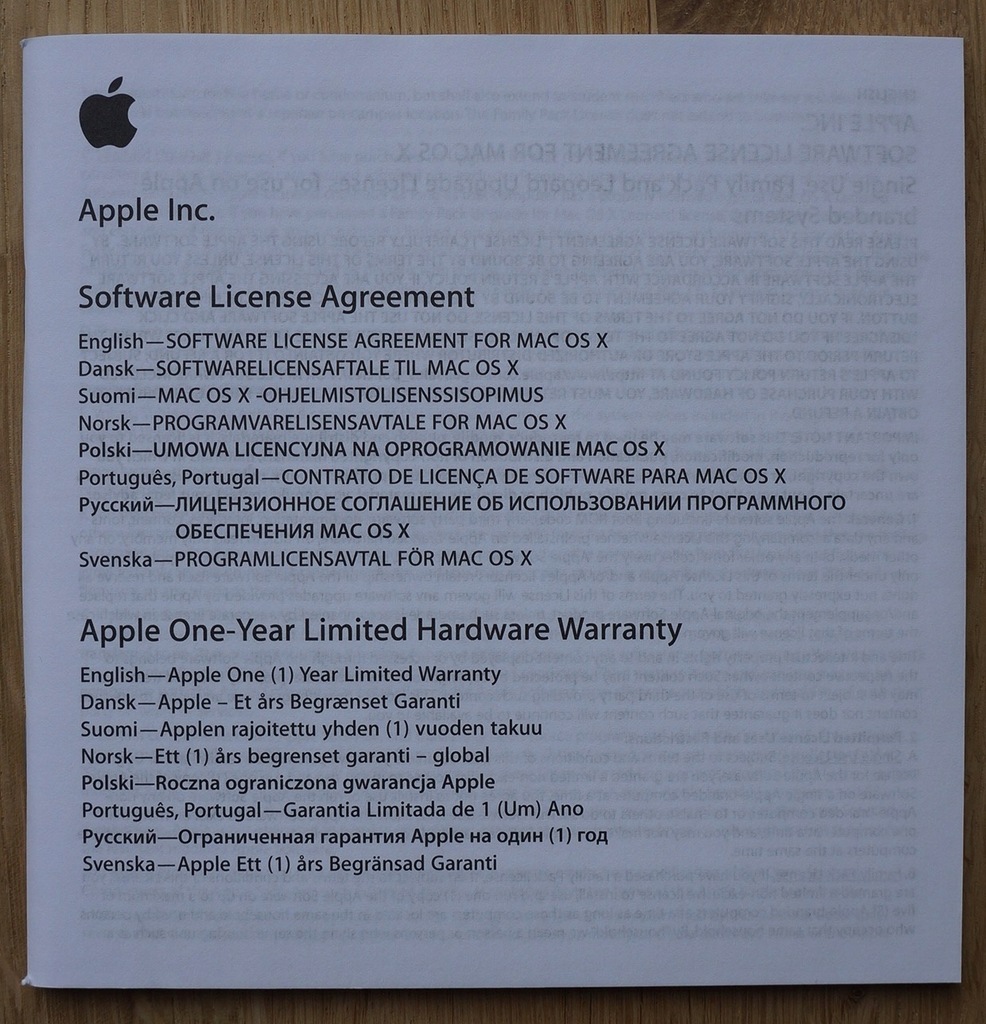 W OPAKOWANIU JEST TEŻ UMOWA LICENCYJNA NA OPROGRAMOWANIE MAC OS X ORAZ NAKLEJKI.