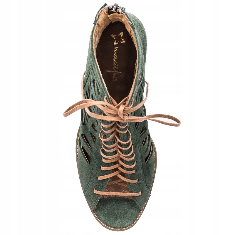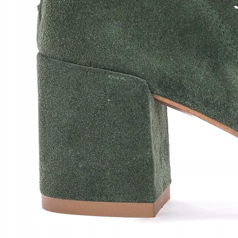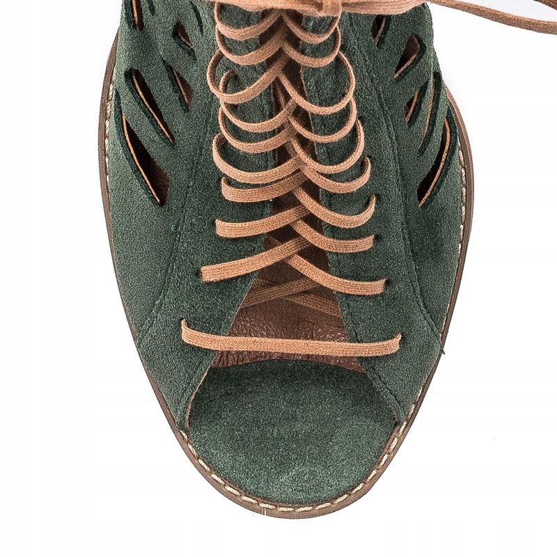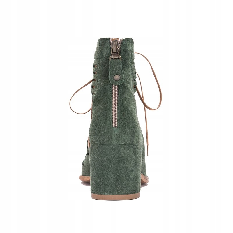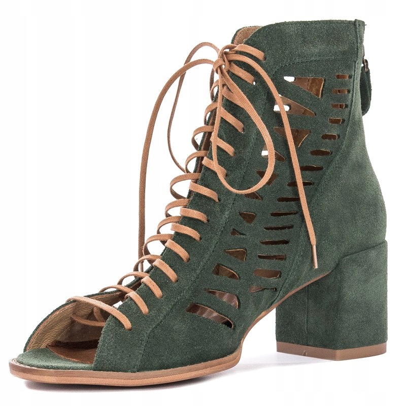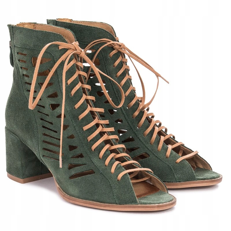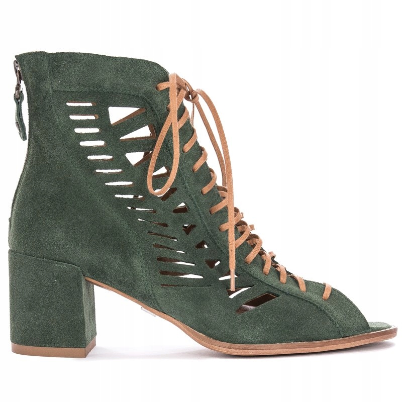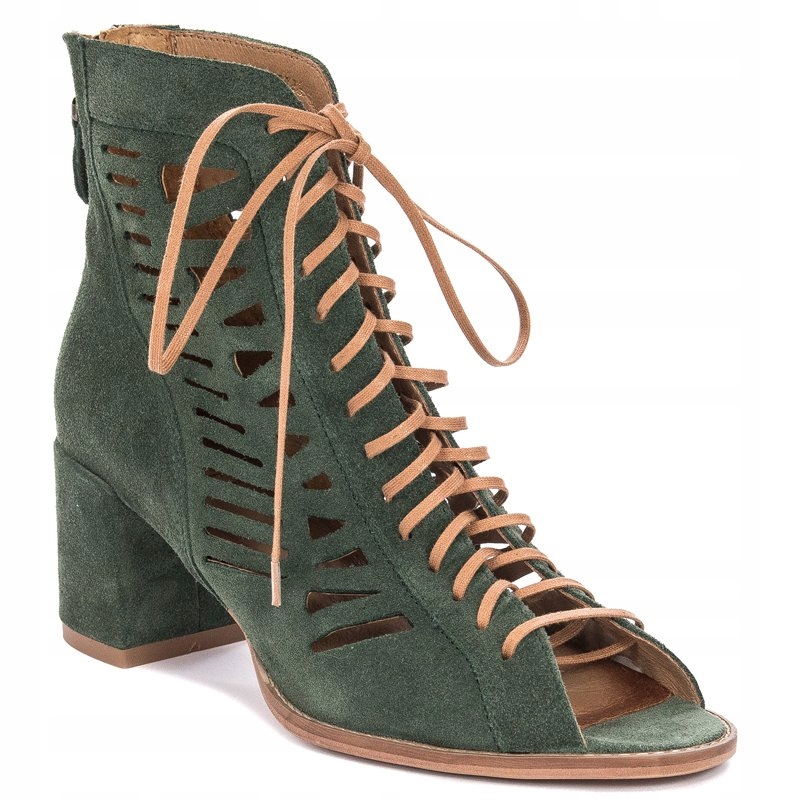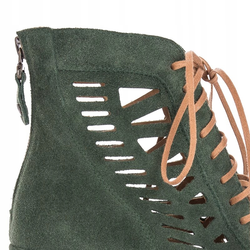 Ażurowa cholewka o wysokości 12 cm została wykonana ze skóry naturalnej welurowej w kolorze zielonym. Dzięki sznurowadłom idealnie dopasujesz cholewkę do tęgości stopy. Miękka wkładka oraz wnętrze są wykonane ze skóry naturalnej. Model z okrągłym otwartym noskiem oraz słupkowatym obcasem o wysokości 6 cm.