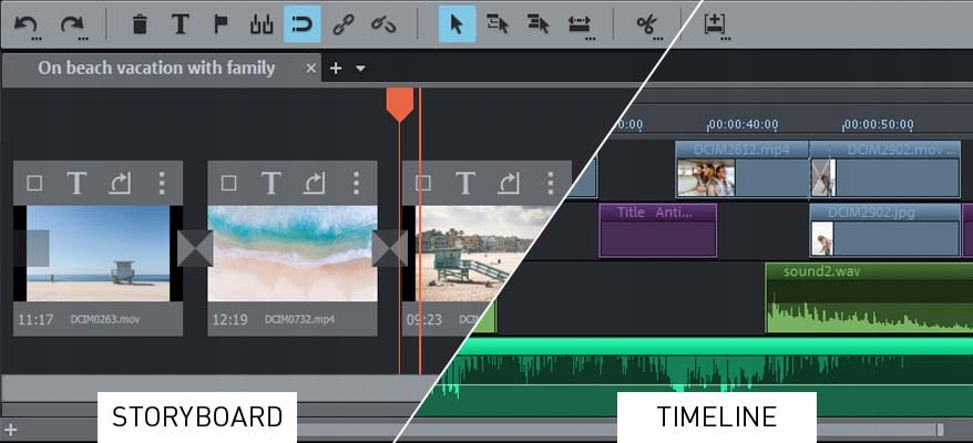 Każdy ma preferowany sposób pracy. W Movie Edit Pro możesz wybrać: jeżeli decydujesz się na tryb scenorysu, film jest wizualizowany podobnie jak scenariusz. W celu wykonania szczegółowej obróbki swoich filmów należy przejść do trybu osi czasu z widokiem ścieżek.