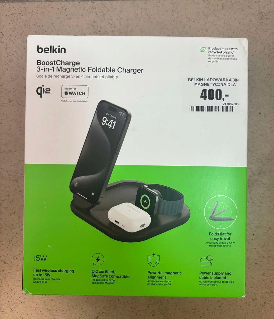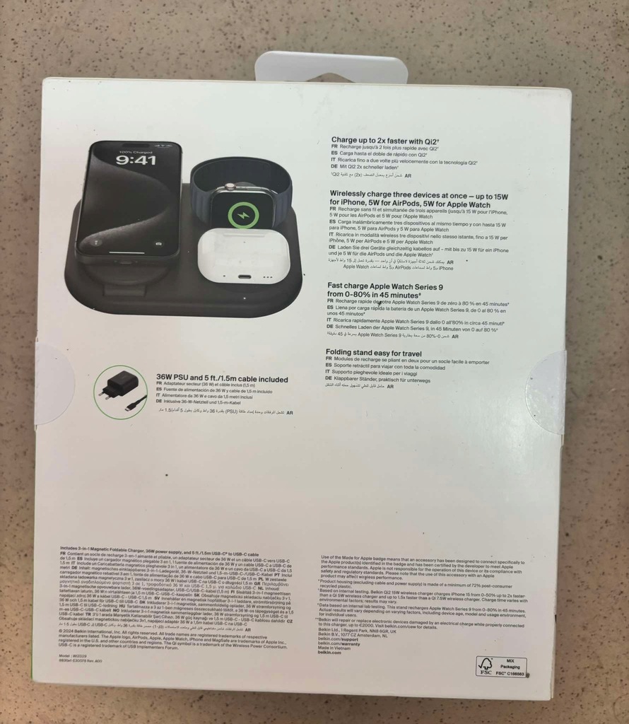 - Akcesoria w zestawie: Magnetyczna składana ładowarka 3 w 1 Kabel USB-C na USB-C o długości 1,5 m Zasilacz USB-C o mocy 36 W