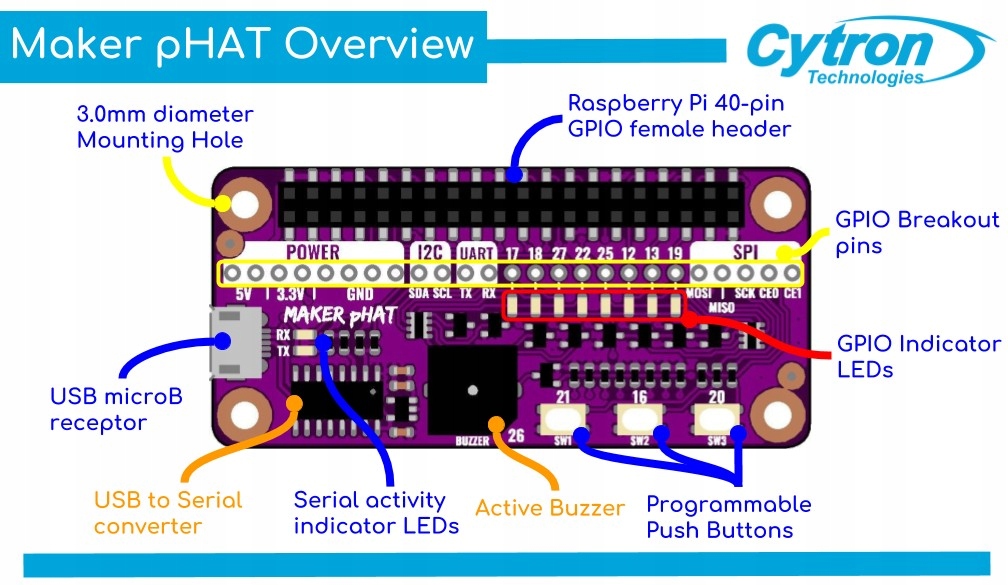 Nakładka pHAT dla Raspberry Pi, posiada podpisane wyprowadzenia GPIO ułatwiające rozpoznanie poszczególnych pinów, trzy programowalne przyciski, diody statusowe LED dla portów GPIO oraz aktywny buzzer.