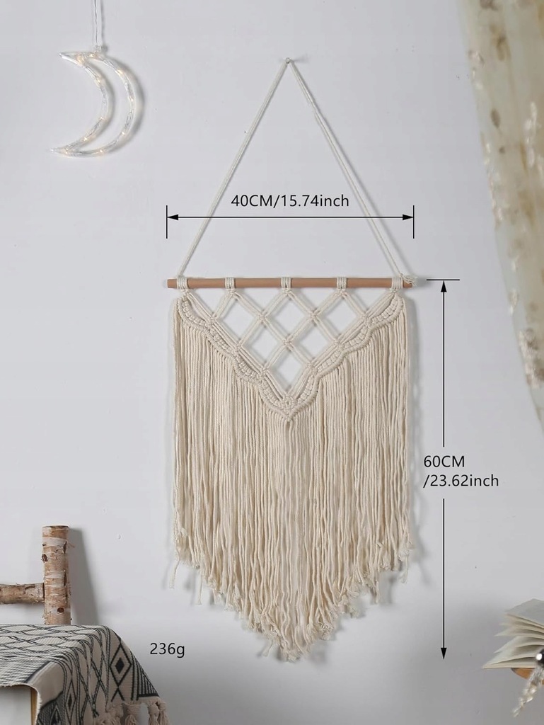 - Idealny do dekoracji niemal każdej przestrzeni wewnętrznej i zewnętrznej. Świetnie sprawdzi się jako dekoracja wezgłowia łóżka, ściany galerii obrazów lub wąskiej ściany nad sofą, kominkiem lub oknem, dodając każdemu pomieszczeniu odrobinę boho.