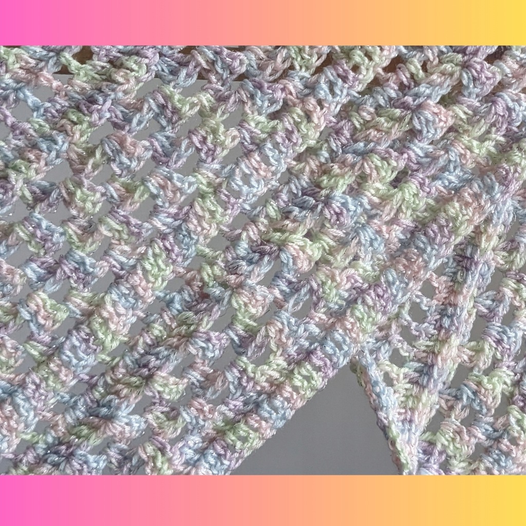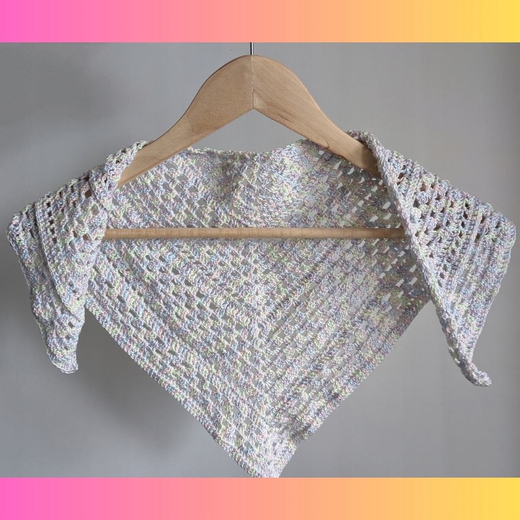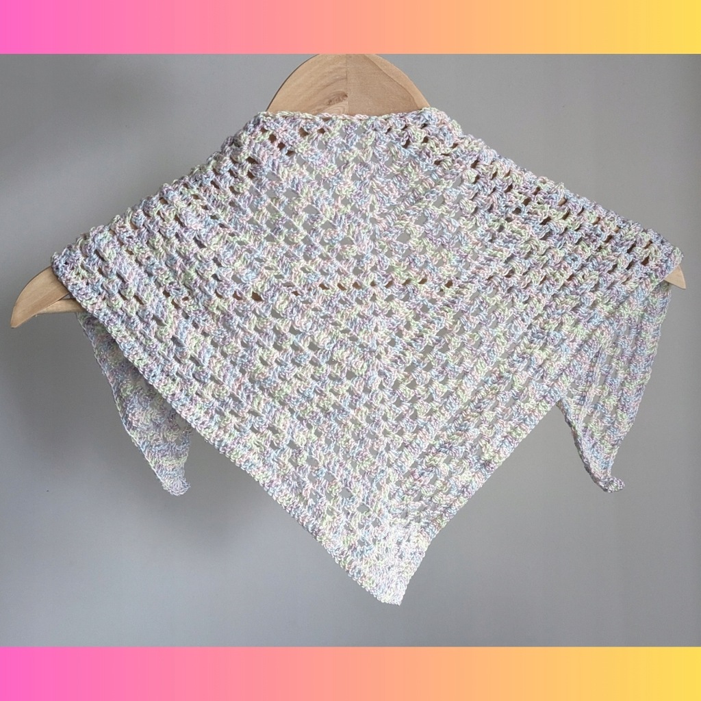Piękna, ażurowa, ręcznie szydełkowana chusta w jasnych pastelowych kolorach z delikatną srebrną nitką. Idealna dla małej dziewczynki.