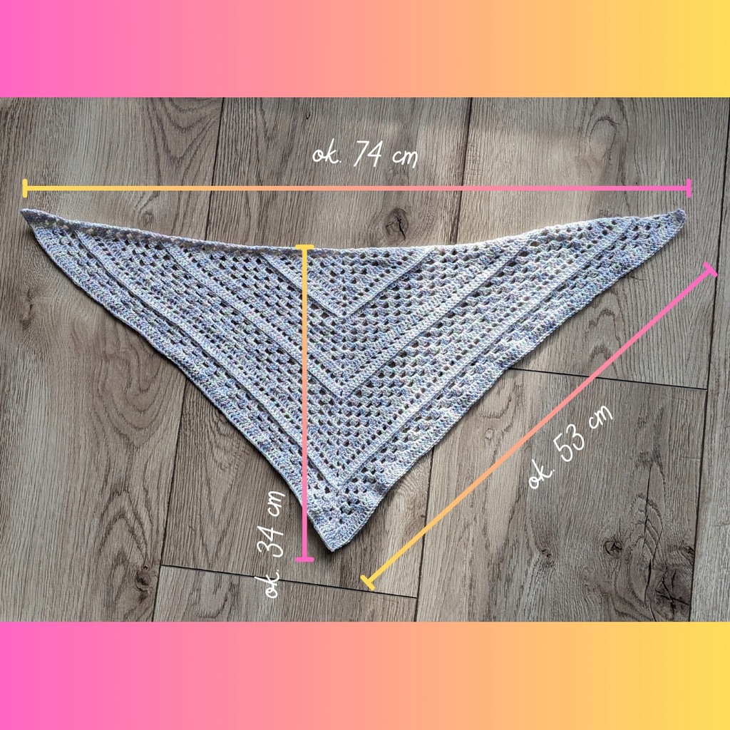 - Wymiary chusty: 74 cm najdłuższy bok, 34 cm wysokość