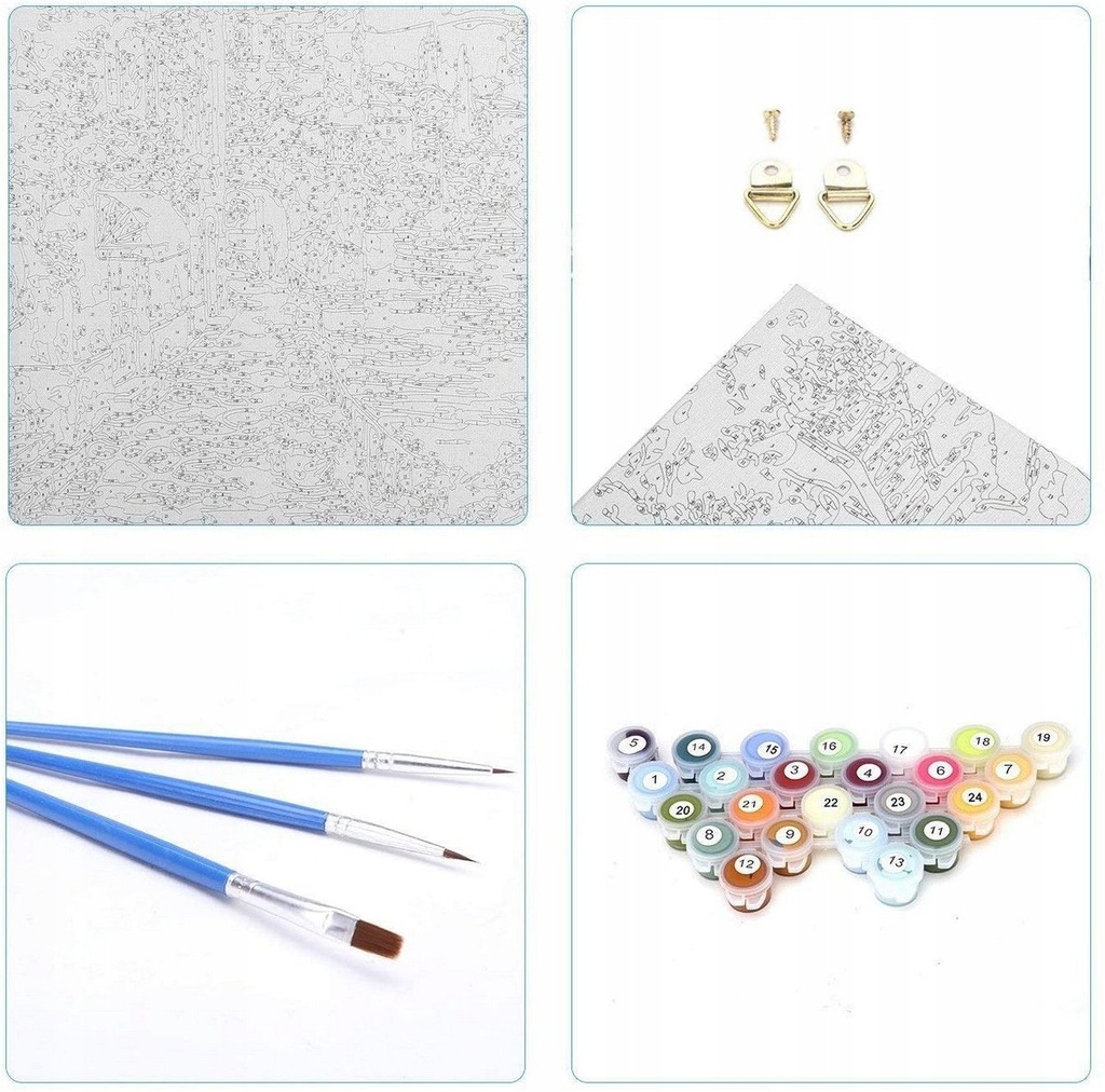 - W zestawie: płótno, farby, haczyki, krosno, pędzle w 3 różnych wielkościach