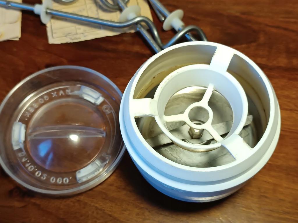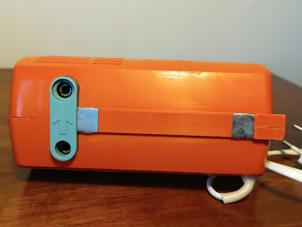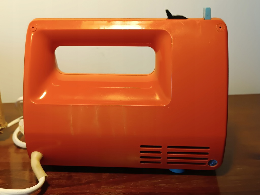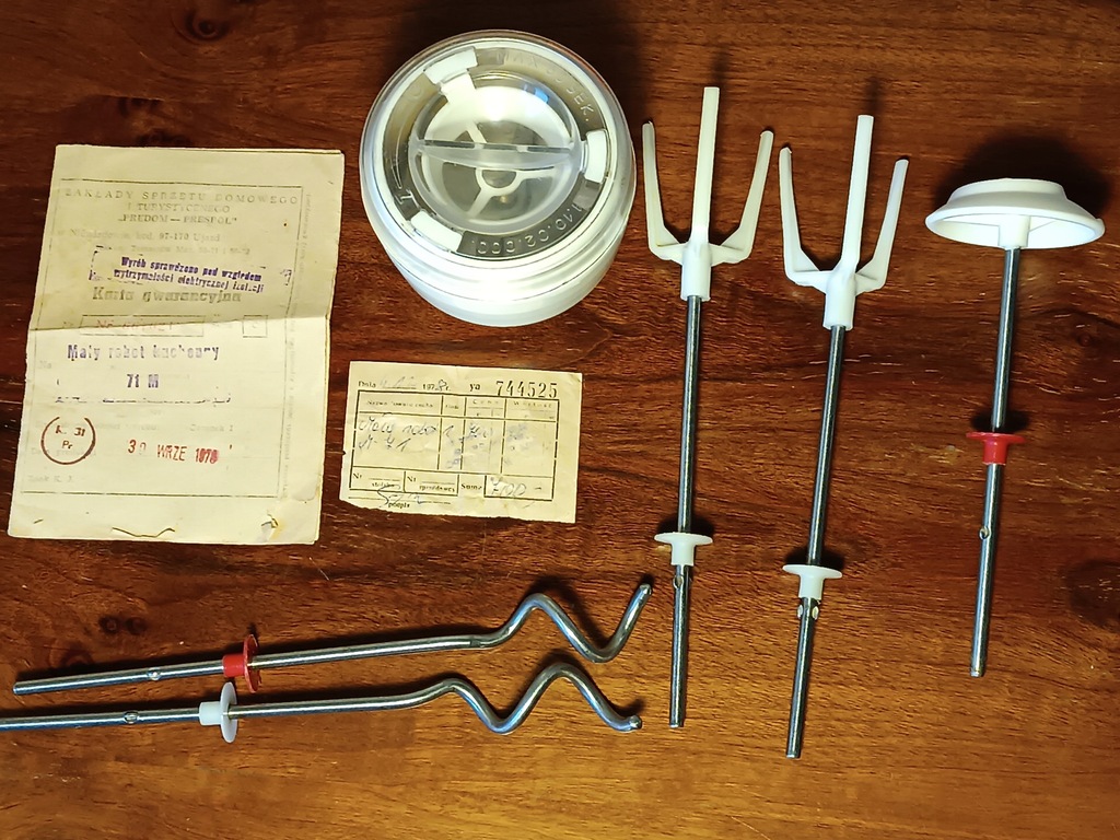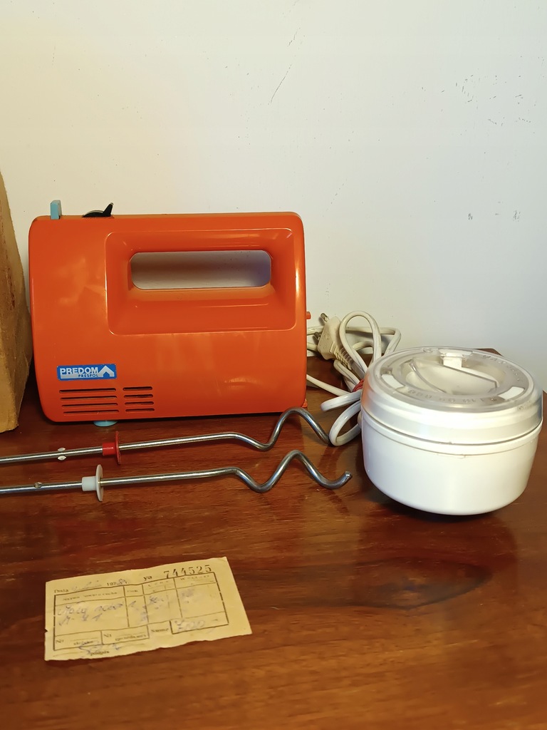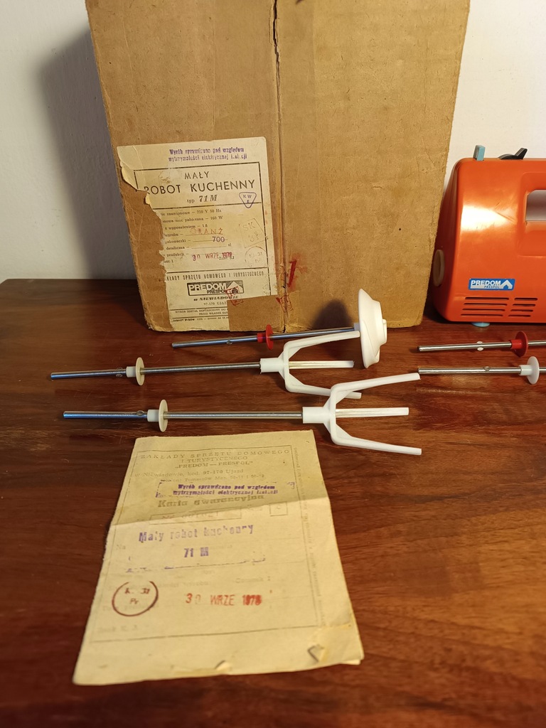 Mikser firmy Predom z 1978 r razem z młynkiem do kawy. Silnik działa równo, przyciski sprawne. Mikser działa bez problemu i ładnie, ale młynek po nałożeniu kręci się słabo, bo wyrobioną jest plastikowa nasadka kręcąca młynkiem. Nie wpływa to na pracę miksera. Karta gwarancyjna i karta produktu oryginalne. Pudełko również oryginalne, w którym mieści się cały komplet. Sprzedaję ją jako eksponat i pamiątkę z PRL, a nie jako urządzenie do codziennego używania. Mikser jest z 1978 r., więc ma ponad 45 lat. Nie próbowałem miksować nim ciasta.