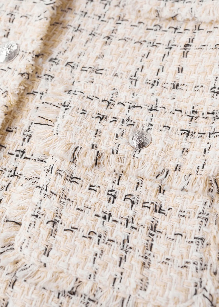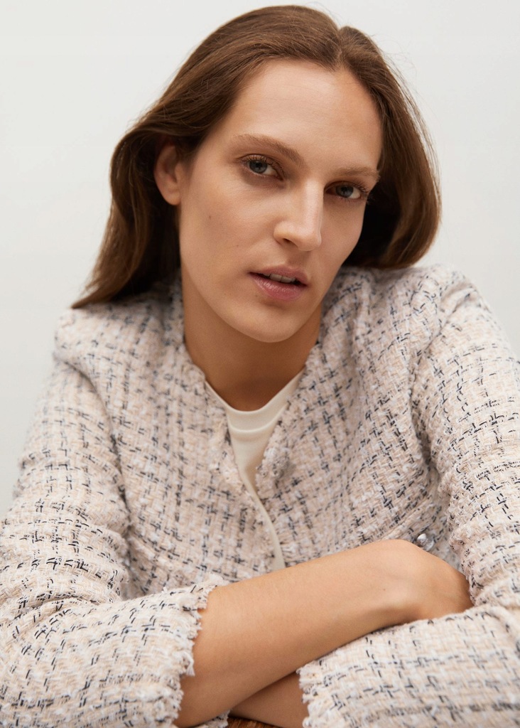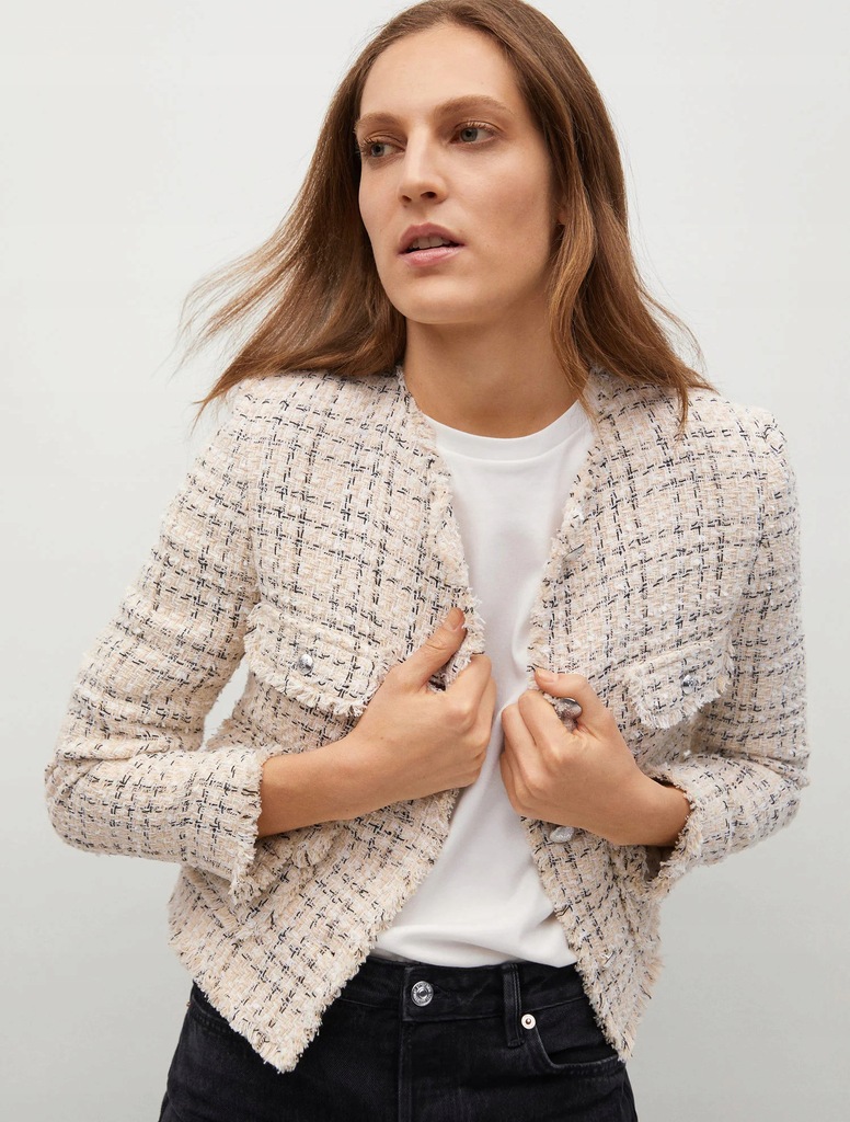 Nowa z papierowymi metkami marynarka firmy MANGO. Kolor pudrowo kremowy w kratkę. Fason typu chanel tweedowa i ciekawie strzępiona. Zapinana na srebrne eleganckie guziki. Na ramionach posiada cienkie poduszeczki i w talii 2 zewnętrzne kieszonki z klapkami. Podszyta poliestrową podszewką. Skład: 57% bawełna, 37% poliester, 4% wiskoza, 4% poliamid i 2% akryl.