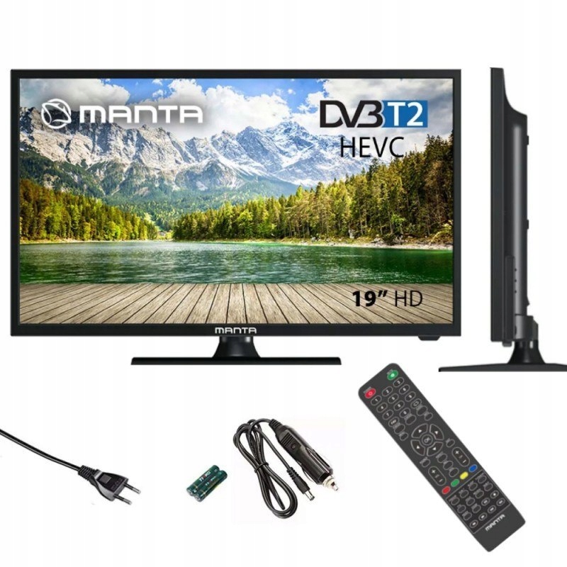 Właściwości: ekran 19 cali, rozdzielczość 1366x768 (HD), odbiornik DVB-T2 H.265/HEVC, niski pobór energii (poniżej 0,5 W), przejściówka do zapalniczki samochodowej, wyraźne detale i głębia kolorów, ekran LED, wysoki kontrast statyczny i dynamiczny, obraz cyfrowy, mocne głośniki, pilot w zestawie.