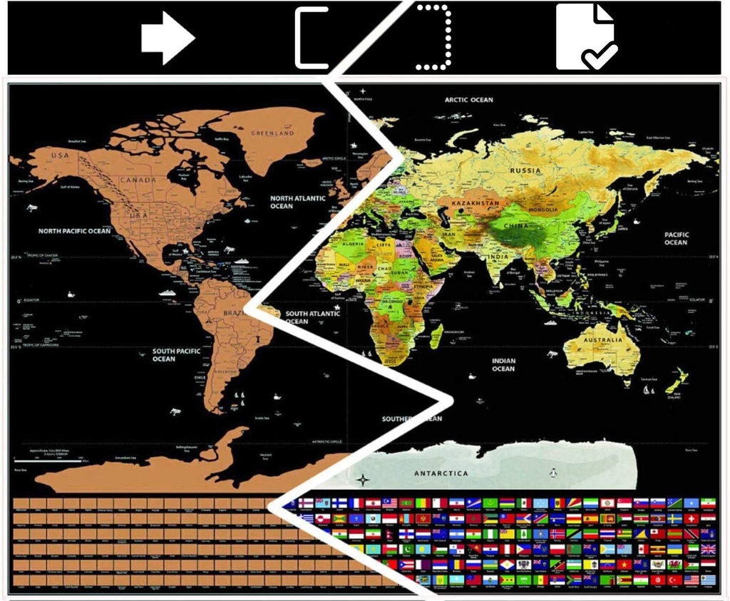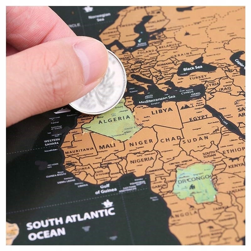 - WYSOKA JAKOŚĆ WYKONANIA - produkt jest wykonany klasycznie, kolor czarny został połączony ze złotym. Każde z państw oraz kontynentów zostało pokryte folią aluminiową do zdrapywania. Folia ma jednolity kolor, jednak po zdrapaniu pokażą się różne odcienie i dokładne kontury poszczególnych krajów. Papier z jakiego wykonano zdrapkę jest wykonany z odpowiedniej struktury, a jego jakość jest wysoka, dzięki czemu podczas zdrapywania nie ma ryzyka, że papier się uszkodzi i będzie wyglądał niekorzystnie.