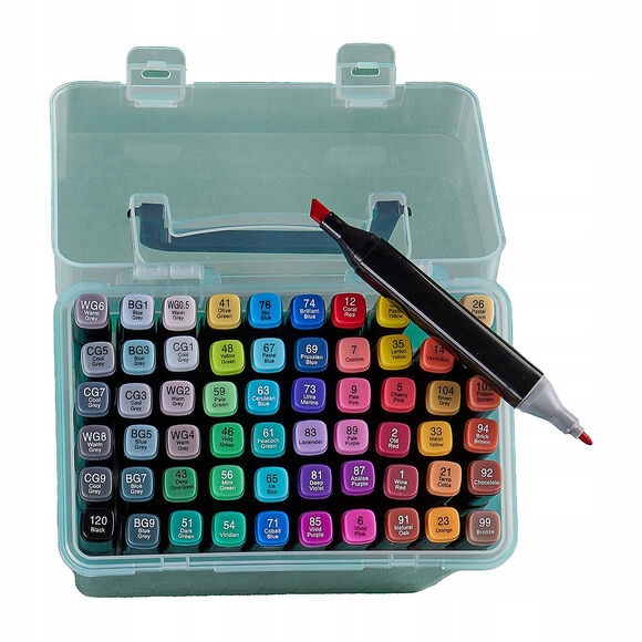 to 60 kolorów w szerokiej gamie barw wraz z organizerem. To profesjonalne markery, które są permanentne i wodoodporne. Posiadają dwie funkcjonalne końcówki: okrągłą (3 mm) i szeroką (6 mm). Zapakowane zostały w praktyczne pudełko z rączką. Charakteryzują się wysoką wydajnością pisania od 200 do 400 m.