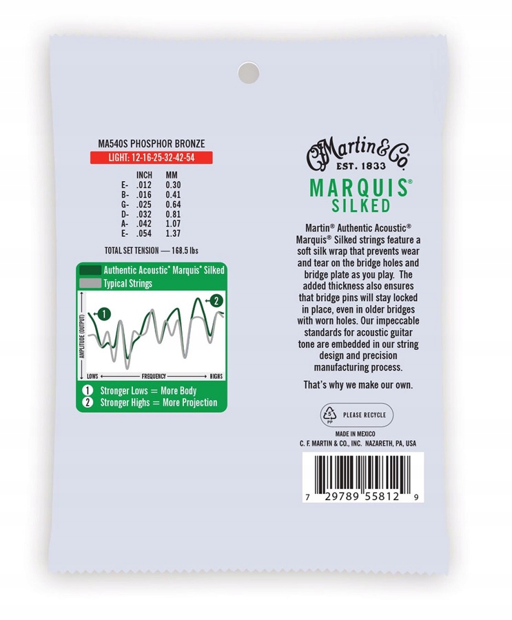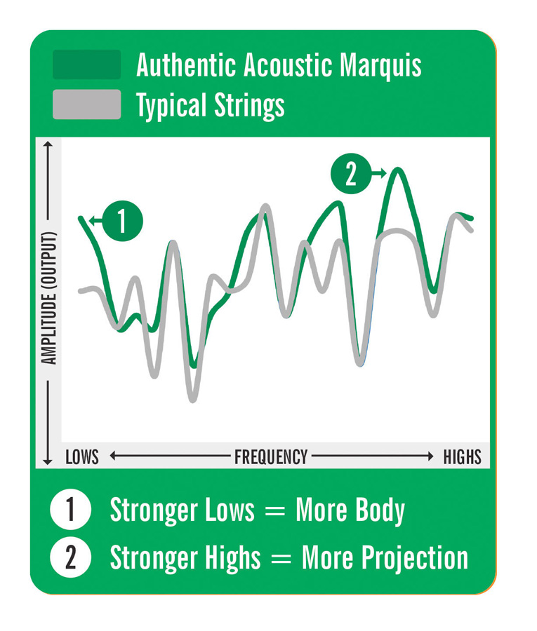 Najnowszą serię Authentic Acoustic Marquis wyróżnia miękka cienka owijka z jedwabiu w miejscu styku z mostkiem gitary. Dzieki temu otwory nie wyrabiają się, a zwiększona grubość struny w tym miejscu zapewnia pewne utrzymywanie nawet w wyrobionych starych mostkach. Struny pakowane są w hermetyczne opakowanie, zapewniające świeżość.