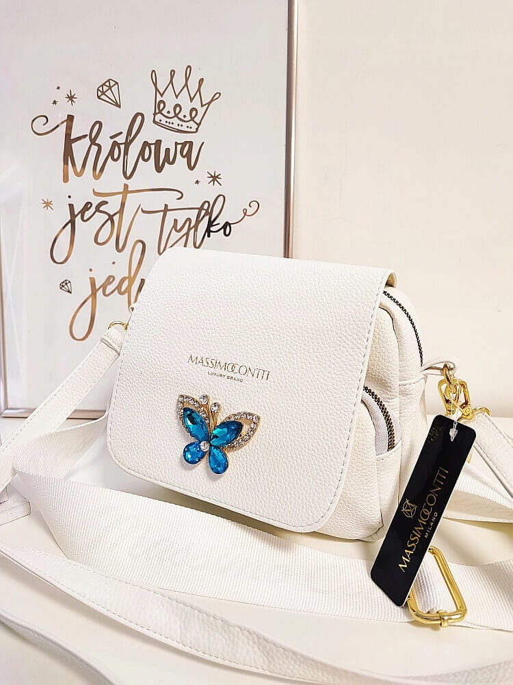 Torebka ozdobiona jest niebieskim motylkiem z kryształków i cyrkonii oraz złotym napisem z logo marki.