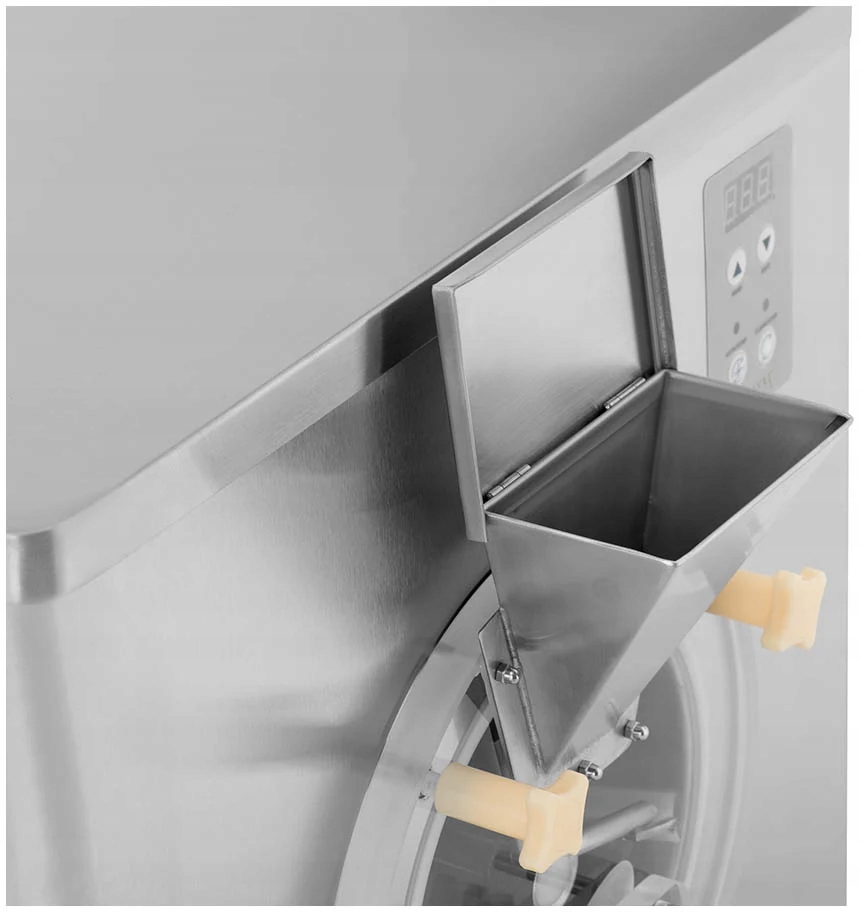 Obudowa automatu do lodów i sorbetów wykonana jest ze stali nierdzewnej. To sprawia, że sprzęt jest solidny i idealny do przetwarzania żywności. Cztery antypoślizgowe gumowe nóżki zapewniają bezpieczne ustawienie maszyny do lodów włoskich.