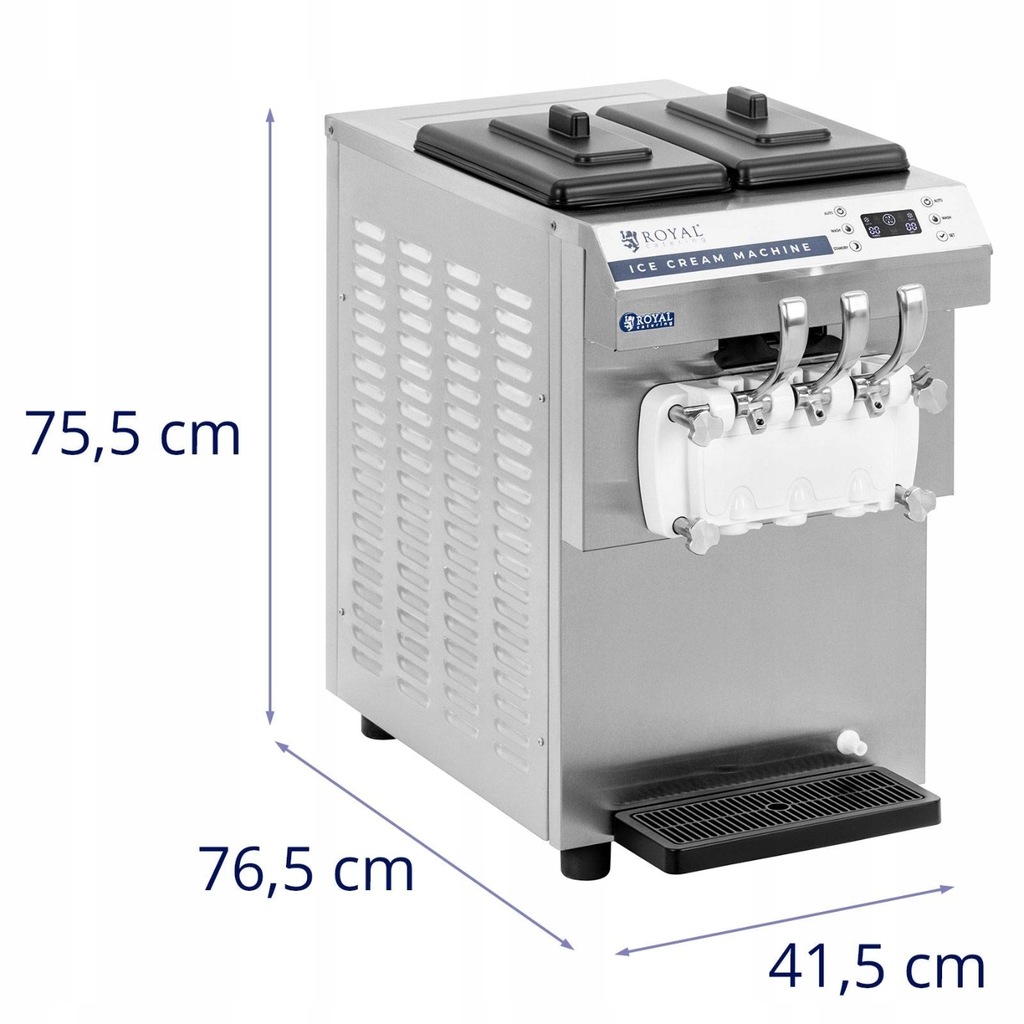Profesjonalna maszyna do lodów włoskich marki Royal Catering pozwala przygotować 16 l lodów miękkich, sorbetów lub mrożonych jogurtów w ciągu godziny. Ze względu na dużą pojemność 14,2 l, urządzenie nadaje się do ruchliwych barów, lodziarni, kawiarni i sprawdzi się podczas imprez plenerowych. Obudowa jest wyjątkowo wąska, dzięki czemu automat z łatwością zmieści się na małych blatach. Wskazówka: aby uzyskać idealnie kremową konsystencję należy jednorazowo nałożyć 60 - 80 g lodów w odstępie ok. 10 s. Do tego modelu poleca się stosowanie składników w proszku. Maszyna pozwala zaserwować klientom dwa różne smaki lub wymieszać je razem, uzyskując trzy smaki. Maszyna ma moc 1350 W. Silnik klasy przemysłowej umożliwia podawanie zawsze idealnie kremowej masy - niezależnie czy będą to lody, jogurt czy sorbet. Panel sterowania z wyświetlaczem LED jest łatwy w obsłudze. Maszyna posiada system wstępnego chłodzenia i czuwania, a także funkcję liczenia i czyszczenia. Wyświetlacz informuje również o zużyciu mieszanki w pojemniku i konieczności jej uzupełnienia. Pokrywka ochroni masę lodową przed zabrudzeniem i utrzymuje stabilną temperaturę wewnątrz urządzenia. Maszyna do lodów jest wykonana z higienicznej i łatwej w pielęgnacji stali nierdzewnej. Wyjmowane elementy łatwo wyczyścić w zmywarce. To sprawia, że sprzęt jest solidny i idealny do przetwarzania żywności. Maszyna stoi na 4 stabilnych gumowych nóżkach o właściwościach antypoślizgowych.