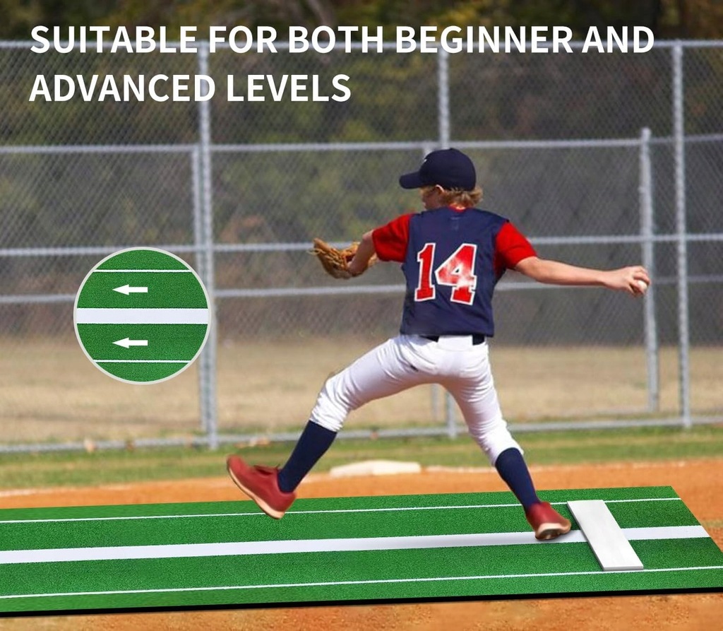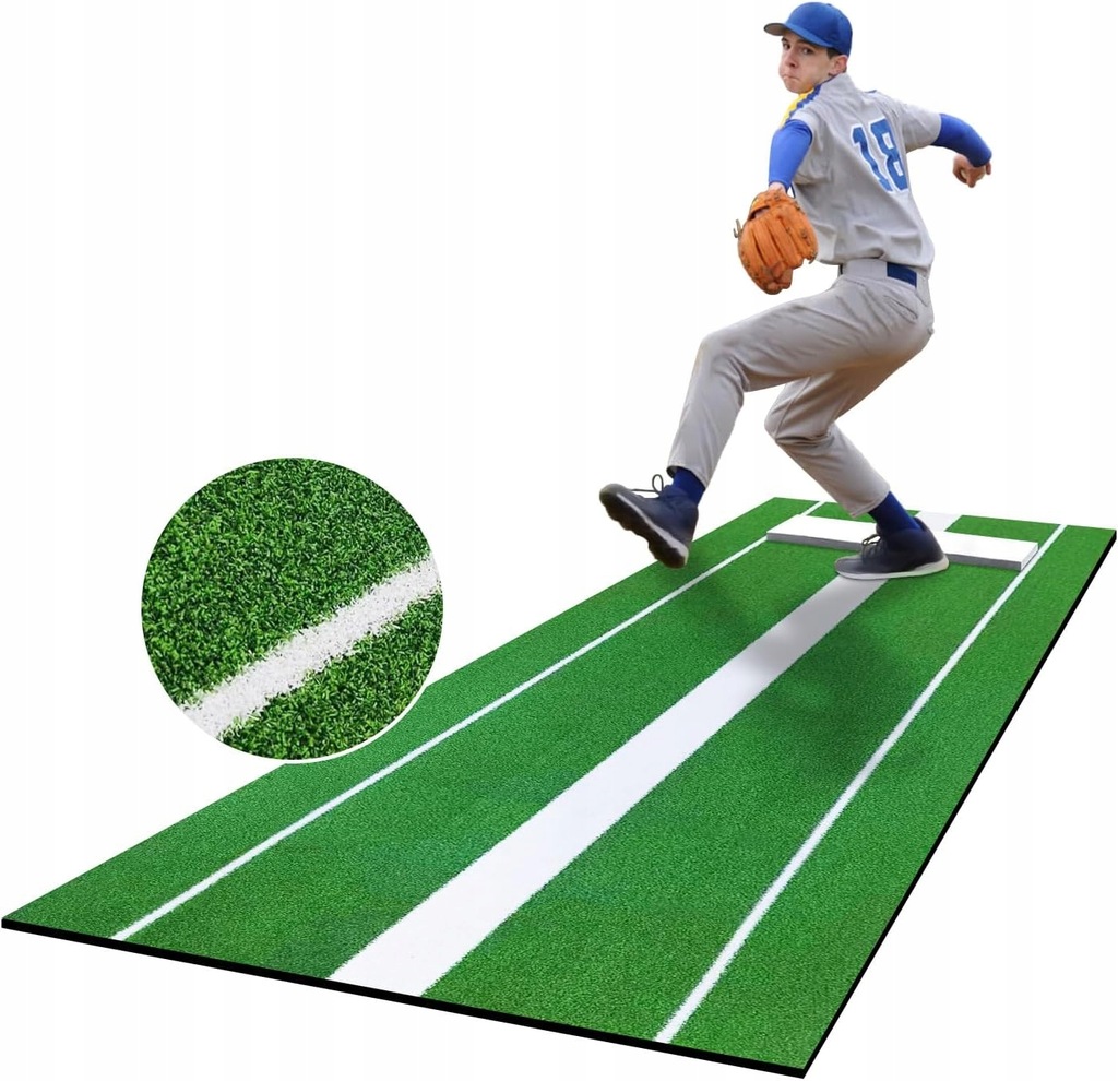Antypoślizgowa mata do rzucania, sztuczna trawa o grubości 8 mm, dostarczana z gumową deską do rzucania o wymiarach 24"x6" z linią środkową o szerokości około 4", wyznaczaną przez pozycję oparcia; Podkładki do rzucania do softballu są wyposażone w gumową wyściółkę o grubości 5,5 mm, który działa również w korkach.