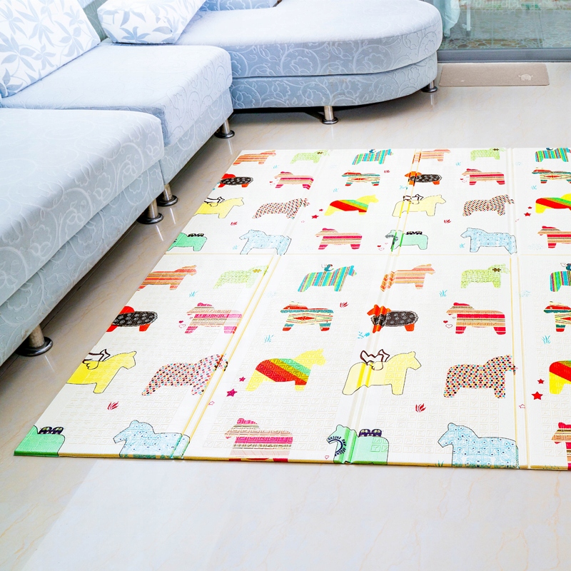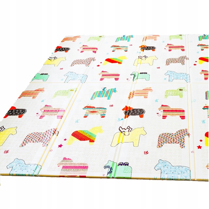 Wzór na pierwszej stronie maty to kolorowe koniki. Kolorystyka maty została tak zaprojektowana, aby rozwijać procesy poznawcze dziecka. Druga strona maty strona maty służy do nauki literek oraz cyferek. Po tej stronie znajduje się alfabet oraz sympatyczne zwierzątka które na pewno rozbudzą ciekawość dziecka i staną się elementem wspólnej edukacyjnej zabawy.