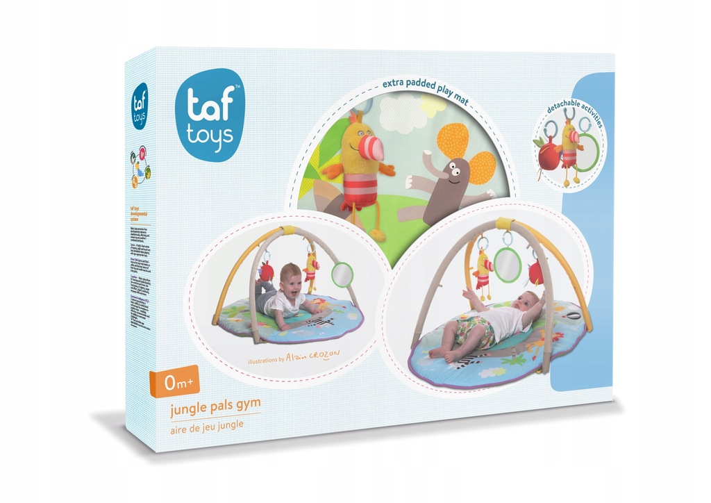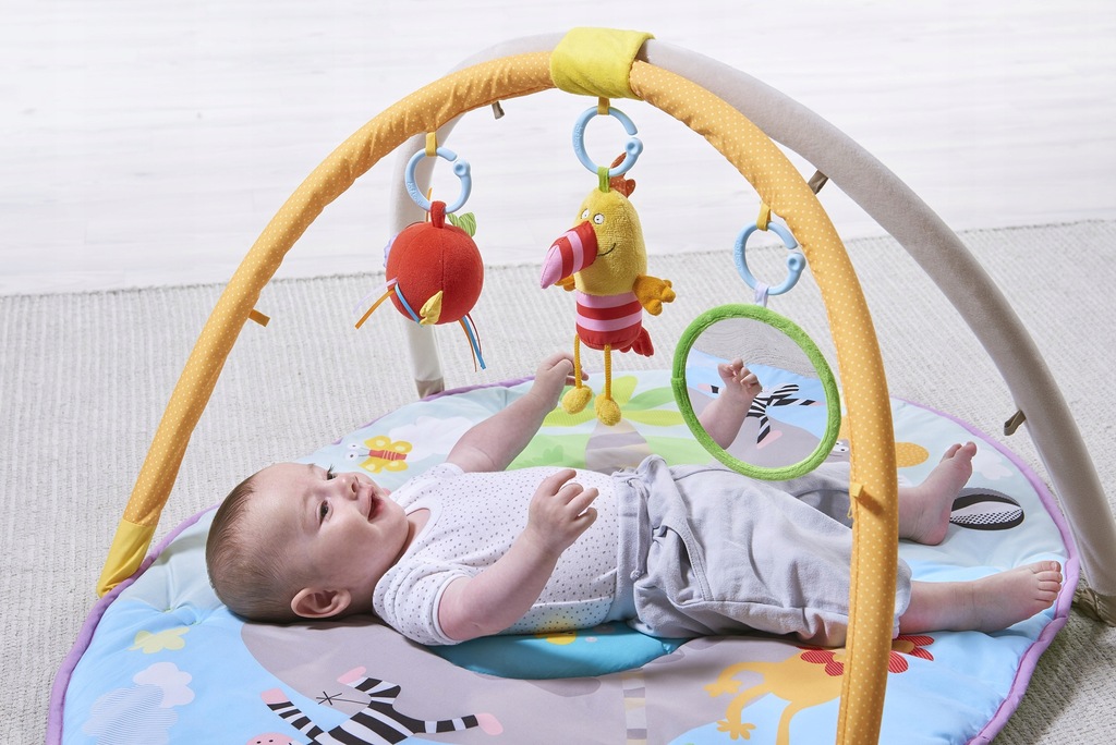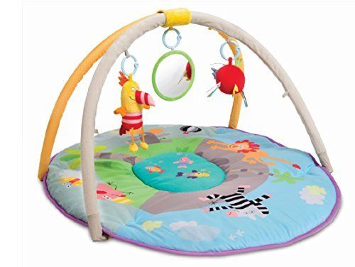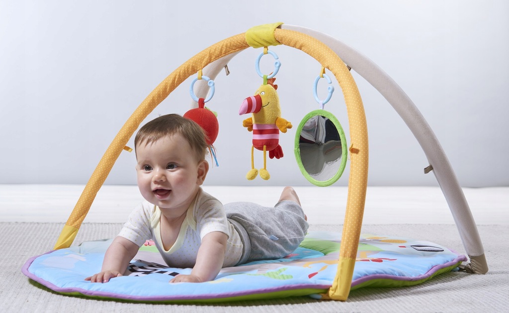 Kolorowa,miękko wyściełana mata z wesołymi zabawkami zawieszonymi na elastycznych pałąkach.Wiszące zabawki:dzwoneczek tropikalny ptak,zabawna piłeczka .duże lusterko bezpieczne dla dziecka oraz prześliczne ilustracje zwierzątek pobudzają zmysły,stymulują rozwój zdolności motorycznych oraz rozwijają inteligencję emocjonalną dziecka.Lekka i łatwa do przenoszenia.