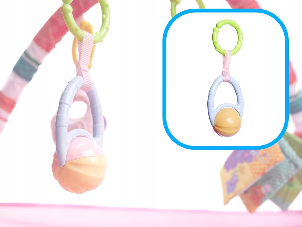 - Mata z zabawkami zawieszonymi na pałąkach- kolorowe zabawki zawieszone na pałąku będą przyciągały uwagę maluszka i motywowały do ćwiczenia i wzmacniania mięśni karku, rąk i nóg. Dodatkowo świetnie sprawdzi się podczas pierwszych prób samodzielnego siadania.