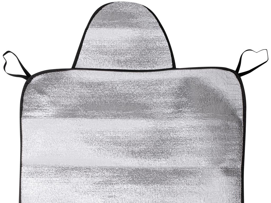 Praktyczna mata ochronna na szybę. Niezastąpiony gadżet każdego kierowcy. Latem będzie zapobiegać przed nagrzewaniem się auta, zimą zabezpieczy szybę przed mrozem i śniegiem. Materiał: poliester. Kolor: srebrny. Wymiar kurtyny: 140cm x70cm.