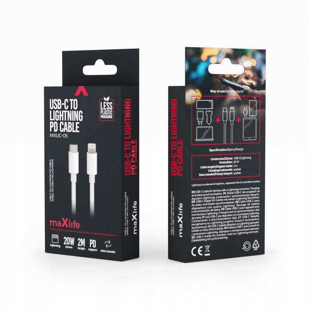 Kabel marki Maxlife ze złączem USB-C- Lightning. Funkcja szybkiego ładowania pozwoli Ci oszczędzić Twój cenny czas. Komfortowa długość kabla gwarantuje swobodne podłączenie urządzeń, nawet tych daleko znajdujących się od gniazdka. Solidne wykonanie zapewnia prawidłowe funkcjonowanie kabla.