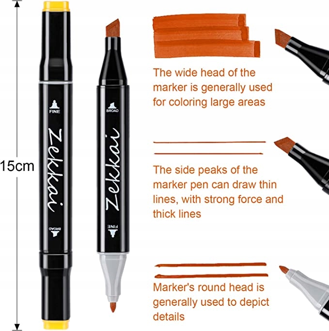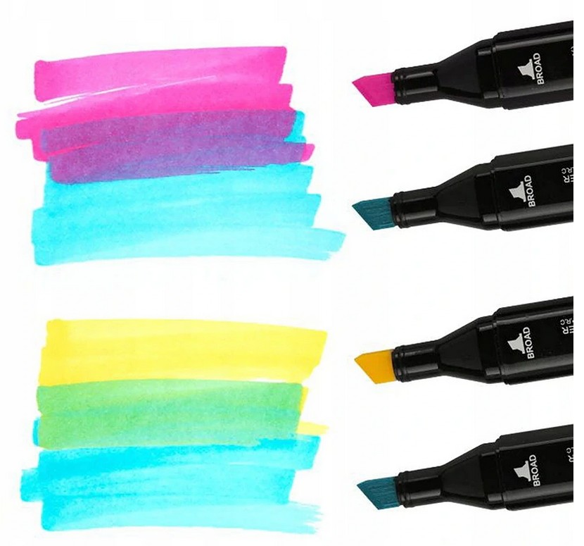 Dwie końcówki; szeroka / płaska oraz cienka / punktowa – dają ogromne możliwości twórcze. Końcówki wykonano z odpornego na ścieranie tworzywa, dzięki czemu markery będą służyć przez długi czas. Włókno końcówek nie rozwarstwia się, nie oddziela i nie podcieka. Nasączony tuszem wkład wykonany został w sposób gwarantujący równomierną dystrybucję tuszu – bez wysychania, wylewania i plam!