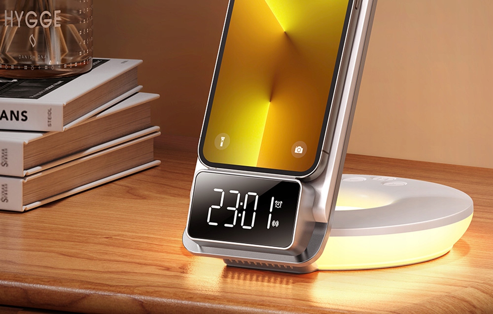 Ładowarka została stworzona z dbałością o najmniejsze detale. Wyposażono ją w niewielki wyświetlacz LED, który nie tylko pełni funkcję zegara, ale również informuje o ustawionym budziku czy procesie ładowania. Co więcej, wbudowany czujnik automatycznie dostosuje jasność wyświetlacza do panujących warunków oświetleniowych w pomieszczeniu. Antypoślizgowe nakładki zapewniają niezbędną stabilność, a dzięki składanej konstrukcji możesz zabrać ze sobą ładowarkę, gdzie tylko zechcesz.