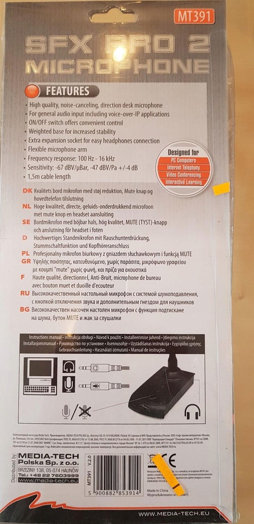 Specyfikacja techniczna: Wysokiej jakości, niskoszumowy, kierunkowy mikrofon biurkowy Do wszelkich zastosowań audio w tym aplikacji typu voice-over-IP Wyłącznik ON/OFF Ciężka, stabilna podstawa Dodatkowe gniazdo przedłużeniowe umożliwiające podłączenie słuchawek Elastyczne ramię mikrofonu Częstotliwość przenoszenia: 100 Hz - 16 kHz Czułość: -67 dBV/uBar, -47 dBV/Pa +/-4 dB Długość kabla 1,5m