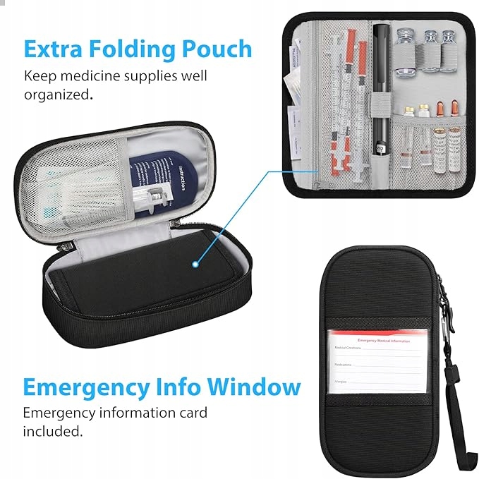 O tym przedmiocie Jedna dodatkowa składana kieszeń do przechowywania wstrzykiwaczy insulinowych, strzykawek insulinowych i fiolek z insuliną. Dwie kieszenie z siatki do przechowywania dwóch wkładów chłodzących. (Dołączono 2 wielokrotnego użytku wkłady chłodzące) Wykonany z wodoodpornego i odpornego na zużycie materiału zewnętrznego, zapobiega potencjalnym zarysowaniom. Izolowana podszewka z piankową wyściółką zapewnia, że adrenalina, wstrzykiwacze insuliny, fiolki, strzykawki lub inne wrażliwe na temperaturę leki nie będą narażone na działanie temperatury zewnętrznej, Twoje zapasy będą bezpieczne i solidnie izolowan w torbie do przenoszenia leków. Dostarczany z przenośnym paskiem na rękę i karabińczykiem, przygotowany na każdą sytuację i możesz iść wszędzie bez obaw, idealnie przenośny i wygodny. Dzięki najwyższej jakości zamkowi błyskawicznemu YKK, ta kompaktowa torba do przenoszenia leków jest trwała i bezpieczna, zapewniając szybki dostęp. Odblaskowy pasek sprawia, że jesteś widoczny w nocy. Torba do przenoszenia leków MEDMAX jest wyposażona w kartę informacyjną na wypadek sytuacji awaryjnej, która zawiera Twoje dane i dane Twojego lekarza. Jest ona przydatna w nagłych wypadkach i oferuje kolejny sposób na zapewnienie bezpieczeństwa. Okienko na identyfikator z tyłu torby może ukryć informacje z karty alarmowej, chroniąc Twoje dane osobowe.