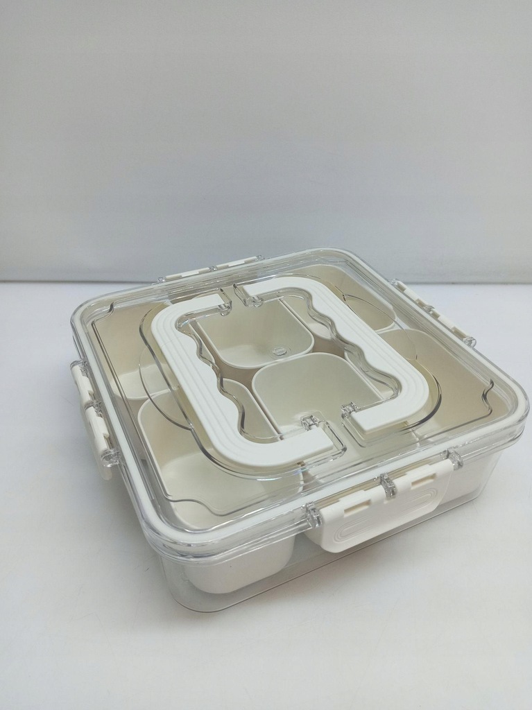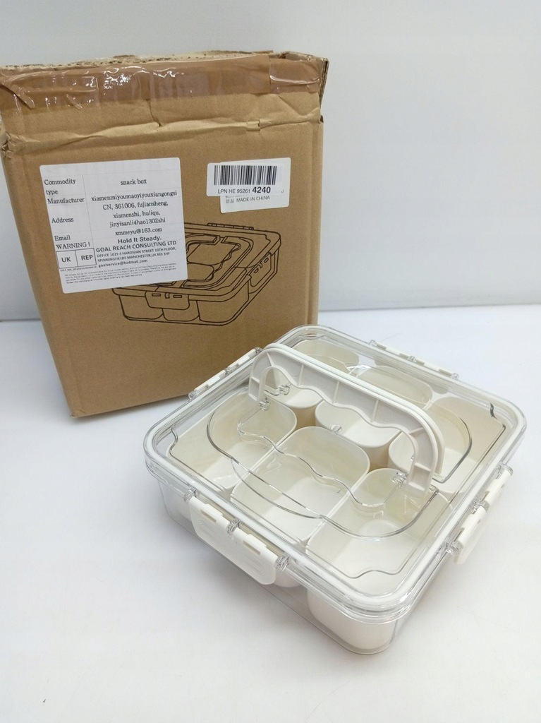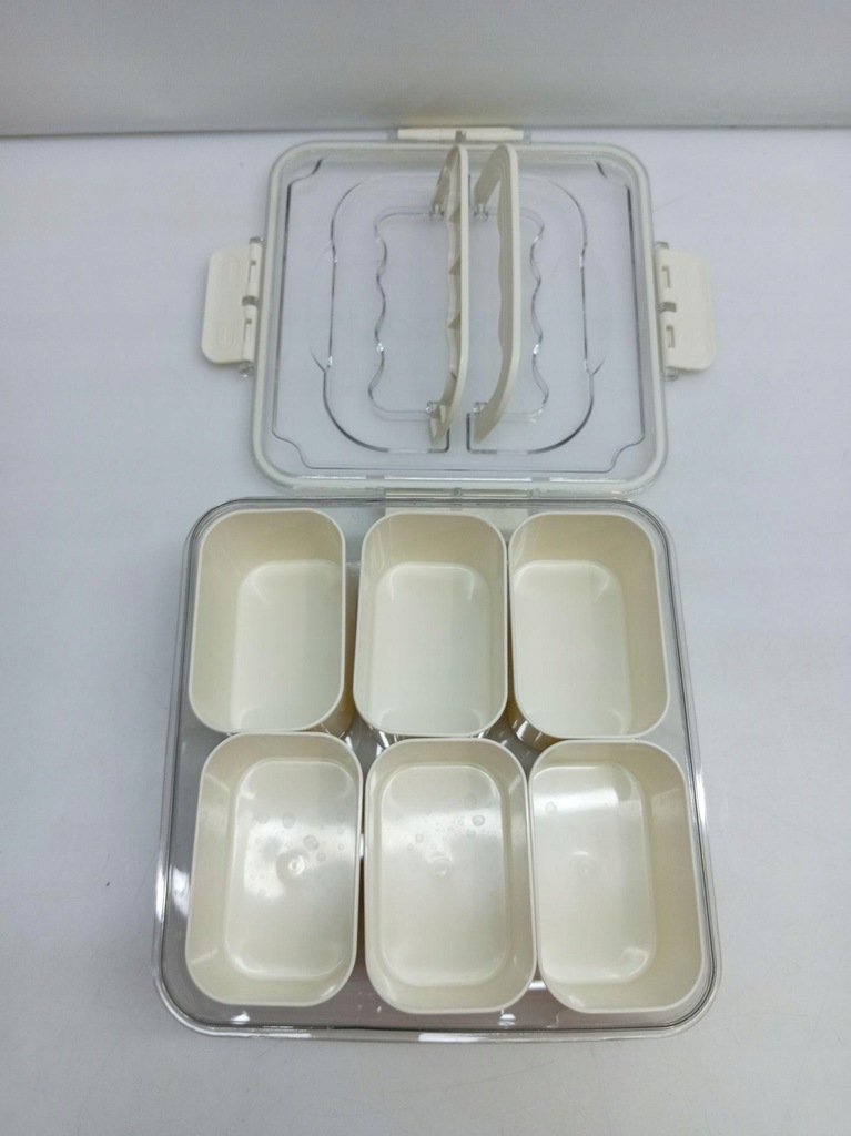 Wszechstronny: To przenośne pudełko ma 6 przegródek, idealne na przekąski, owoce, warzywa, słodycze, przyprawy, orzechy i inne przekąski. Przezroczysta konstrukcja tacki pozwala na szybką i łatwą identyfikację zawartości.