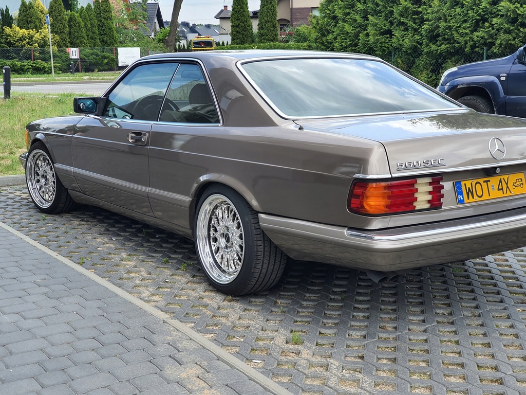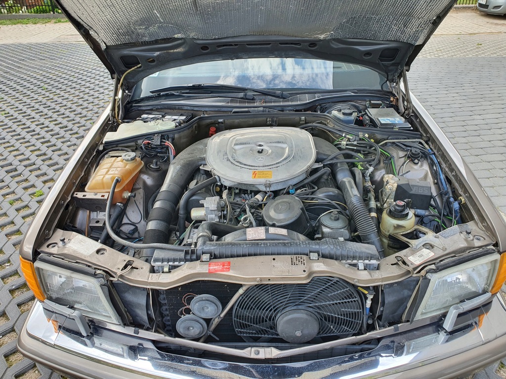 Mercedesa 560 SEC napędzała monstrualna 8-cylindrowa jednostka o mocy 279KM ( w wersji bez katalizatora 300KM! ). Parametry tego silnika nawet dziś są imponujące – maksymalny moment obrotowy 454 Nm – jak na wolnossącą benzynę – rewelacja. Najmocniejsza wersję SEC-a wyposażono standardowo w automatyczną, 4 biegową skrzynię. Auto zazwyczaj używa tylko 3 biegów ( 2,3,4 ) jednak w razie potrzeby rusza z jedynki. Wtedy się dzieje…