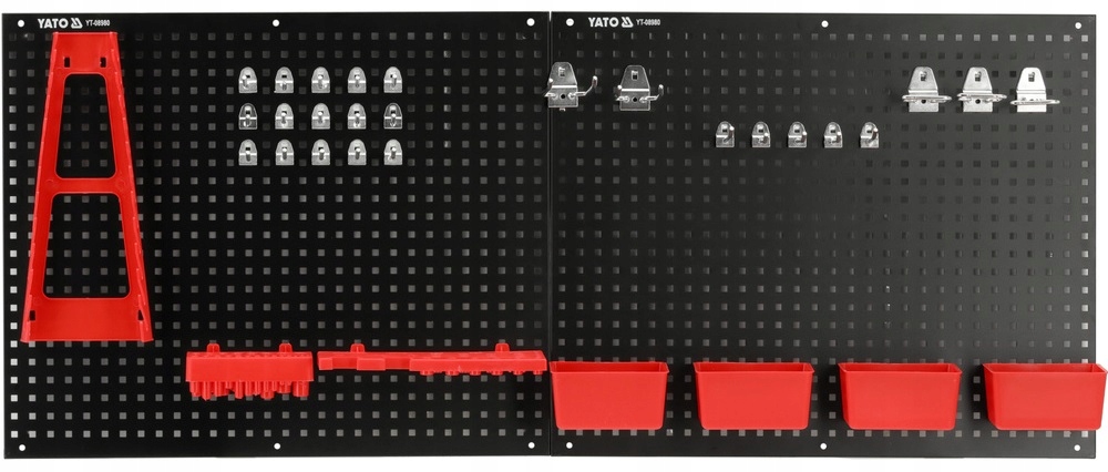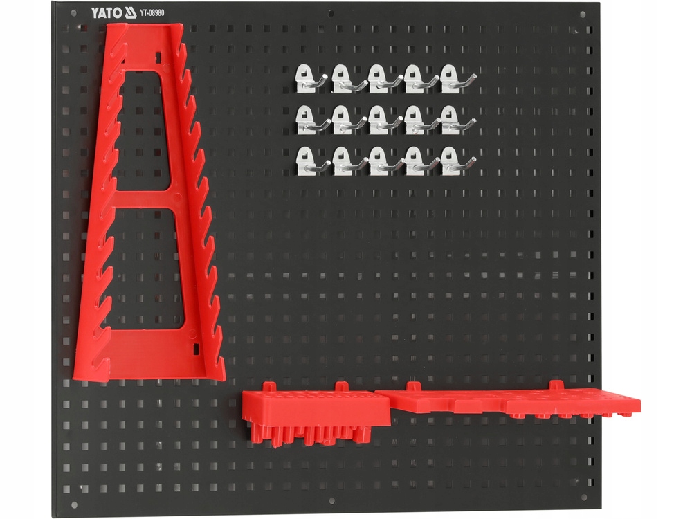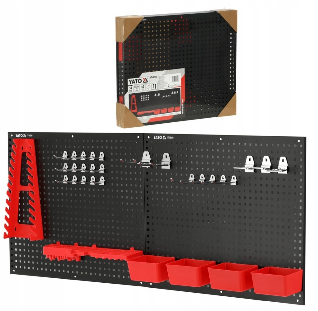 - Zawartość zestawu: tablica perforowana x2, pojemnik plastikowy x4, hak krótki x15, hak długi x5, hak podwójny x2, hak na szczypce x3, uchwyt na klucze płaskie, uchwyt na wkrętaki, uchwyt na wiertła