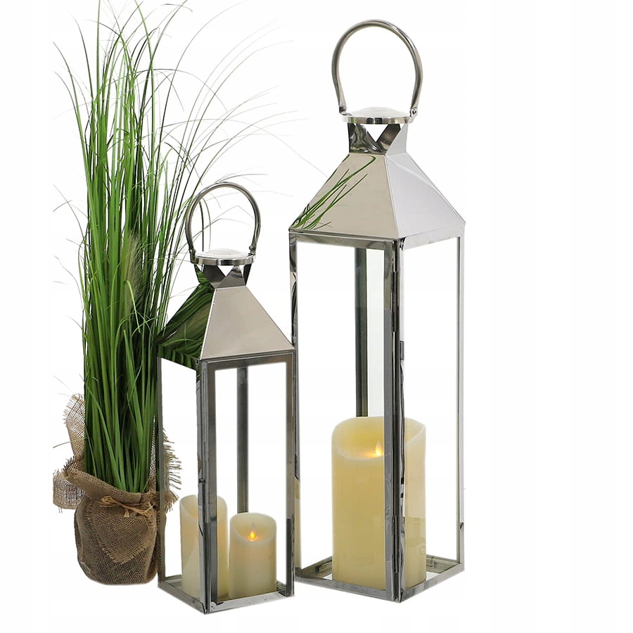 Eleganckie srebrne lampiony. Dodatkowym atutem jest z pewnością matriał, z którego je wyprodukowano, czyli stal chromowana. Latarnie posiadają przeszklone boki, z których jeden stanowi drzwiczki. Na szczycie zamontowany jest uchwyt umożliwiający łatwy transport oraz powieszenie dekoracji.