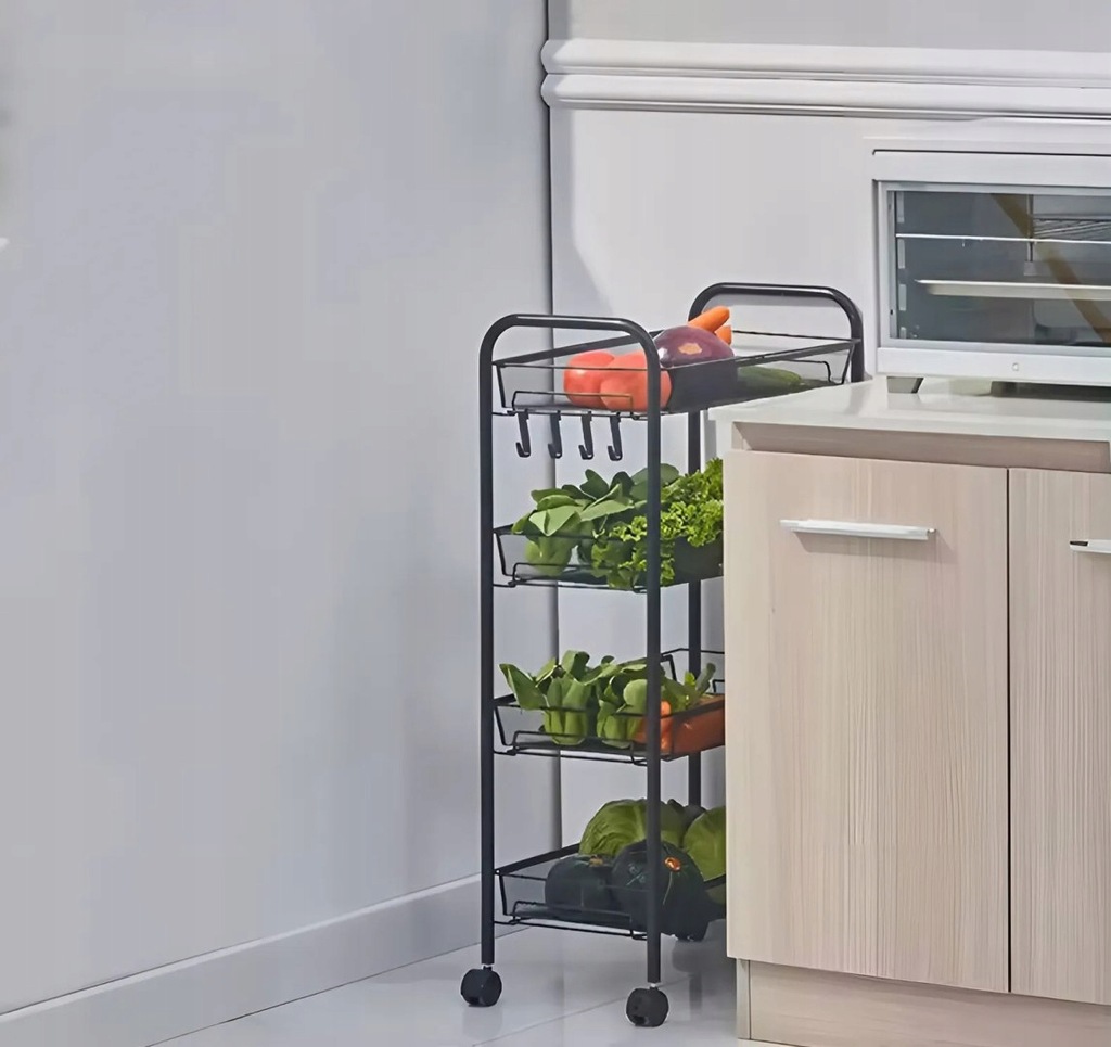 - Regał jest wyjątkowo pojemny i praktyczny. Wyposażony w cztery przestronne koszyki, oferuje mnóstwo miejsca na różnorodne przedmioty, takie jak książki, akcesoria kuchenne, narzędzia czy kosmetyki. Dodatkowym atutem regału są cztery haczyki, które umożliwiają zawieszenie przyborów kuchennych, ręczniczków, ścierek lub innych drobnych przedmiotów, które warto mieć zawsze pod ręką.