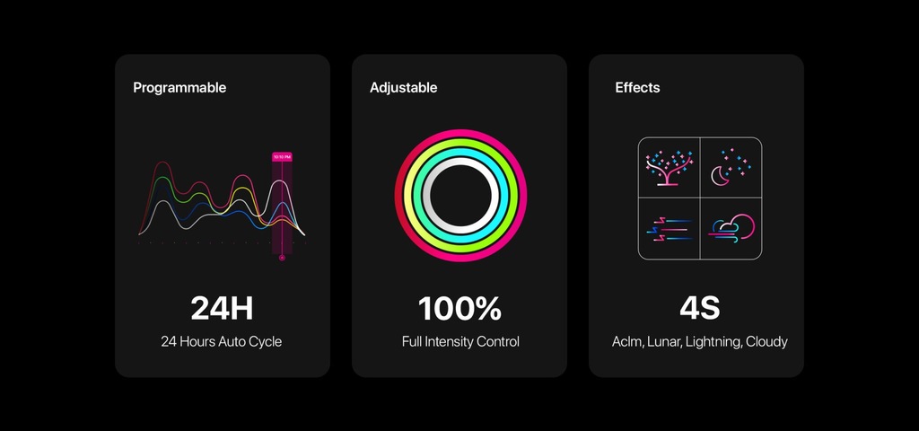 MicMol Master intensyfikuje proces fotosyntezy, a spektrum światła możemy dostosowywać do indywidualnych preferencji. Duża paleta dostępnych ustawień pozwoli każdemu użytkownikowi wybrać swoje ulubione. Regulacja temperatury barwowej i mocy odbywa się za pomocą wbudowanego kontrolera bluetooth i aplikacji iMicMol na Android i iOS. Służy ona także do stworzenia indywidualnego dziennego harmonogramu świecenia lamp i symulowania zjawisk pogodowych takich jak burza.